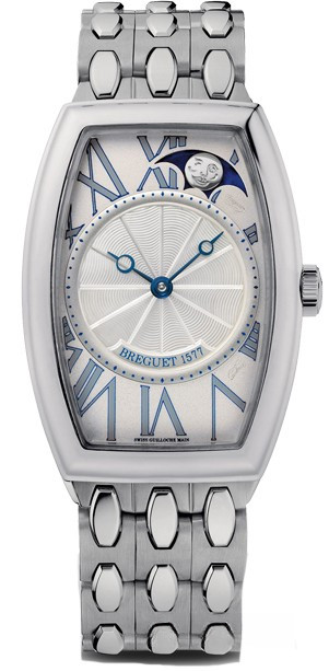 Часы Breguet Heritage 8860 Phases De Lune Retrograde выпущены в корпусе из белого золота 18к, размером 35 х 25 х 9,75 мм и водонепроницаемостью 30 м. Внутри корпуса установлен автоматический механизм с кремниевым спуском, Калибр 586/L. На серебристом гильошированном циферблате отображаются часы, минуты, фаза луны. Запас хода 40 часов. Часы комплектуются браслетом из белого золота 18к.