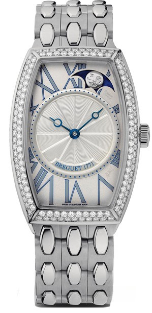 Часы Breguet Heritage 8861 Phases De Lune Retrograde выпущены в корпусе из белого золота 18к, размером 35 х 25 х 9,75 мм и водонепроницаемостью 30 м и безелем из 140-ка белых бриллиантов общим весом 1.14 ct. Внутри корпуса установлен автоматический механизм с кремниевым спуском, Калибр 586/L. На серебристом гильошированном циферблате отображаются часы, минуты, фаза луны. Запас хода 40 часов. Часы комплектуются браслетом из белого золота 18к.