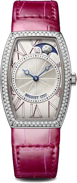 Часы линии Héritage из 18-каратного белого золота. Корпус в форме «бочка». Безель украшен 140 бриллиантами (около 1,14 карата). Автоматический механизм. Ретроградный указатель фаз Луны. Спираль из кремния. Изогнутый циферблат с матовой серебристой отделкой и центральной частью из натурального перламутра с гильошированным вручную узором. Водонепроницаемые до 3 бар (30 м). Ремешок: кожаный. Предлагаются также в версии из розового золота. Размеры: 35 х 25 мм.