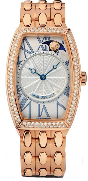 Часы Breguet Heritage 8861 Phases De Lune Retrograde выпущены в корпусе из розового золота 18к, размером 35 х 25 х 9,75 мм и водонепроницаемостью 30 м и безелем из 140-ка белых бриллиантов общим весом 1.14 ct. Внутри корпуса установлен автоматический механизм с кремниевым спуском, Калибр 586/L. На серебристом гильошированном циферблате отображаются часы, минуты, фаза луны. Запас хода 40 часов. Часы комплектуются браслетом из розового золота 18к.