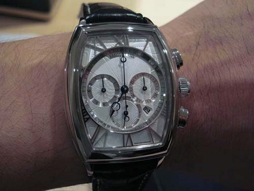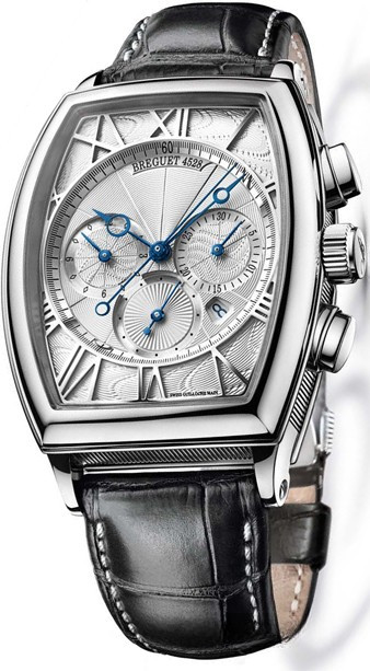 Корпус данной модели выполнен в форме бочки из 18-каратного белого золота, полирован, и обладает параметрами: 42 х 14.45 мм. Боковая сторона корпуса украшена неглубоким рифлением, что вполне характерно для стиля Breguet. Циферблат сделан из цельной пластины 18-каратного золота. Одно из главных достоинств часов - это хронограф. Узор гильоше нанесен вручную и великолепно смотрится на посеребренном циферблате. Стрелки изготовлены из вороненной стали и украшены характерными для стиля Breguet "яблоками". Ультратонкий механизм оснащен калибром 550/1, и имеет запас хода приблизительно 52 часа. Водонепроницаемость модели составляет 30 метров. Ремешок сделан из кожи аллигатора и оснащен золотой застежкой.