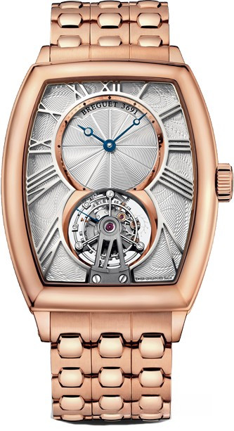 Часам Breguet не нужно иметь привычную круглую форму, чтобы быть узнаваемыми с первого вгляда. Ярким подтверждением этого являются часы коллекции Héritage с характерным изогнутым корпусом в форме "бочка" (tonneau). Стремление воплотить в жизнь творческие идеи XVIII столетия с учетом стилистических требований нынешнего века ставит перед инженерами, часовыми мастерами и дизайнерами циферблатов непростую задачу. Однако им с успехом удается справиться с ней: идеальные обтекаемые линии корпуса и украшенный изящным гильошированным узором циферблат великолепно перекликаются с формой корпусного кольца и креплениями для ремешка. Часы Héritage Tourbillon с изогнутым в двух направлениях корпусом в форме "бочка", из розового золота 18 карат. Механизм с ручным заводом, с турбийоном. Изогнутый в двух направлениях циферблат из посеребренного 18-каратного золота с гильошированным вручную узором. Часовая шкала с накладными римскими цифрами, вырезанными из цельной металлической пластины. Малая секундная стрелка на оси турбийона в положении "6 часов". Турбийон в форме римской цифры также выполняет функцию часового индекса. Запас хода 50 часов. Задняя крышка цельная с видом на механизм турбийона. Часы поставляются на браслете из розового золота 18к.