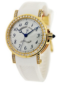 Часы Breguet Breguet Marine 8818 8818BA/59/564 DD00 выпущены в корпусе из желтого золота 18к, размером 30 х 9,4 мм и водонепроницаемостью 30 м с безелем из 58-и белых бриллиантов 1.25 ct. и заводной головкой инкрустированной синим сапфиром кабошоном. Внутри корпуса установлен автоматический механизм, Калибр 537/1. На серебристом гильошированном циферблате с 10-ю белыми бриллиантами 0.025 ct. отображаются часы, минуты, секунды. Запас хода 40 часов. Часы комплектуются каучуковым ремешком с золотой 18к вставкой.