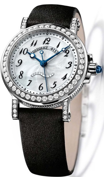 Часы Breguet Marine 8818 8818BB/59/864 DD0D выпущены в корпусе из белого золота 18к, размером 30 х 9,4 мм и водонепроницаемостью 30 м с безелем из 58-и белых бриллиантов 1.25 ct. и заводной головкой икрустированой синим сапфиром кабошоном. Внутри корпуса установлен автоматический механизм, Калибр 537/1. На серебристом гильошированном циферблате с 10-ю белыми бриллиантами 0.025 ct. отображаются часы, минуты, секунды. Запас хода 40 часов. Часы комплектуются атласным ремешком с золотой 18к вставкой, инкрустированной 273-мя белыми бриллиантами 1 ct.