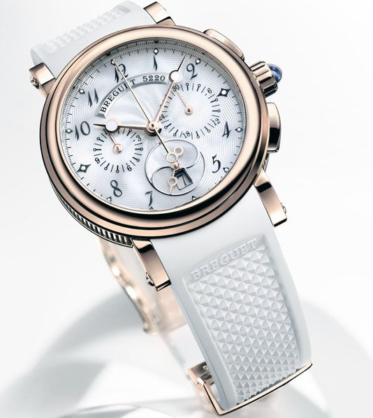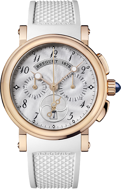 Часы Breguet Marine 8827 8827BR/52/586 выпущены в корпусе из розового золота 18к, размером 34.6 х 12.3 мм и водонепроницаемостью 50 м. Внутри корпуса установлен автоматический механизм с функцией хронографа, Калибр 550. На белом жемчужном гильошированном циферблате отображаются часы, минуты, секунды, дата. Запас хода 45 часов. Часы комплектуются каучуковым ремешком с золотой 18к вставкой и раскладывающейся застежкой.