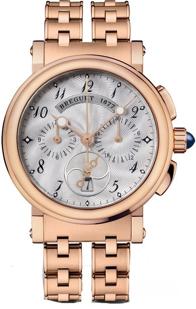 Часы Breguet Marine выпущены в корпусе из розового золота 18к, размером 34.6 х 12.3 мм и водонепроницаемостью 50 м. Внутри корпуса установлен автоматический механизм с функцией хронографа, Калибр 550. На серебристом гильошированном циферблате отображаются часы, минуты, секунды, дата. Запас хода 45 часов. Часы комплектуются браслетом из розового золота 18к.