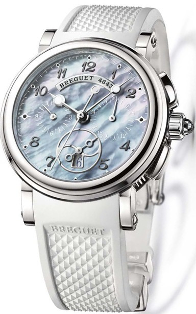Часы Breguet Marine 8827 8827ST/59/586 выпущены в корпусе из нержавеющей стали, размером 34.6 х 12.3 мм и водонепроницаемостью 50 м. Внутри корпуса установлен автоматический механизм с функцией хронорафа, Калибр 550. На белом жемчужном циферблате отображаются часы, минуты, секунды, дата. Запас хода 45 часов. Часы комплектуются каучуковым ремешком с вставкой из нержавеющей стали и откидной застежкой.