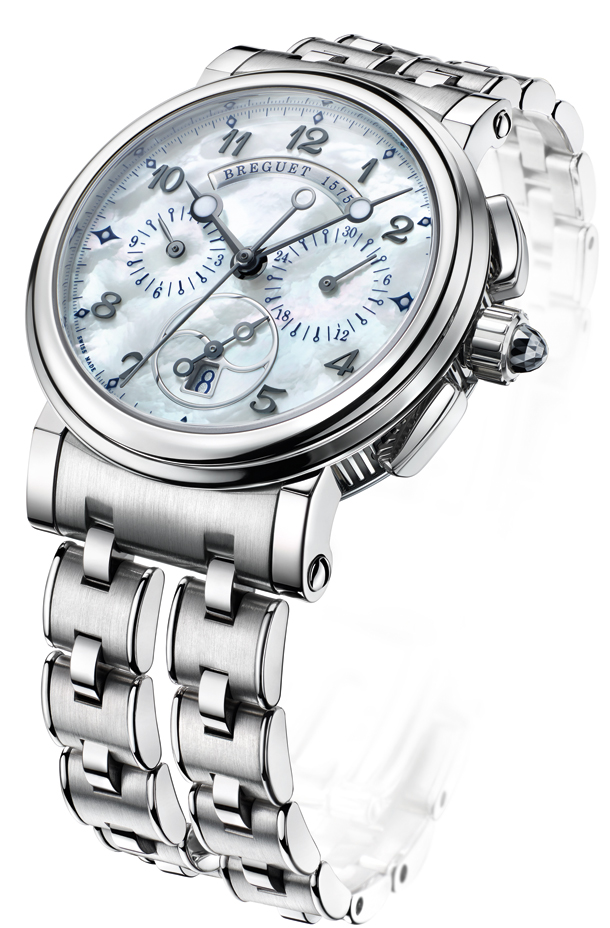 Часы Breguet Marine 8827ST/5W/SM0 выпущены в корпусе из нержавеющей стали, размером 34.6 х 12.3 мм и водонепроницаемостью 50 м. Внутри корпуса установлен автоматический механизм с функцией хронографа, Калибр 550. На белом жемчужном циферблате отображаются часы, минуты, секунды, дата. Запас хода 45 часов. Часы комплектуются браслетом из нержавеющей стали.