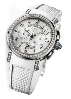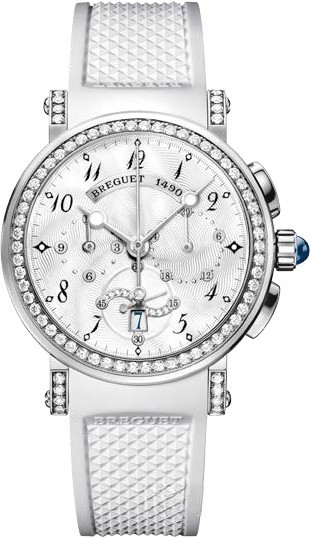 Часы Breguet Marine 8828BB/5D/586 DD00 выпущены в корпусе из белого золота 18к, размером 34.6 х 12 мм и водонепроницаемостью 50 м с корпусом, инкрустированным 74-мя белыми бриллиантами 1.16 ct. и заводным ключем, инкрустированным синим сапфиром кабошоном. Внутри корпуса установлен автоматический механизм с функцией хронографа, Калибр 550. На белом жемчужном гильошированном циферблате отображаются часы, минуты, секунды, дата. Запас хода 45 часов. Часы комплектуются каучуковым ремешком с золотой 18к вставкой и откидной застежкой.