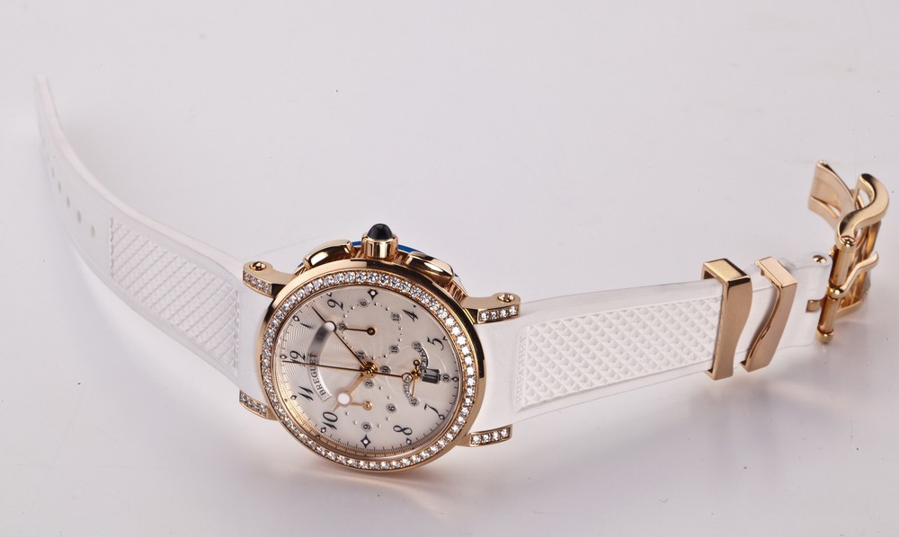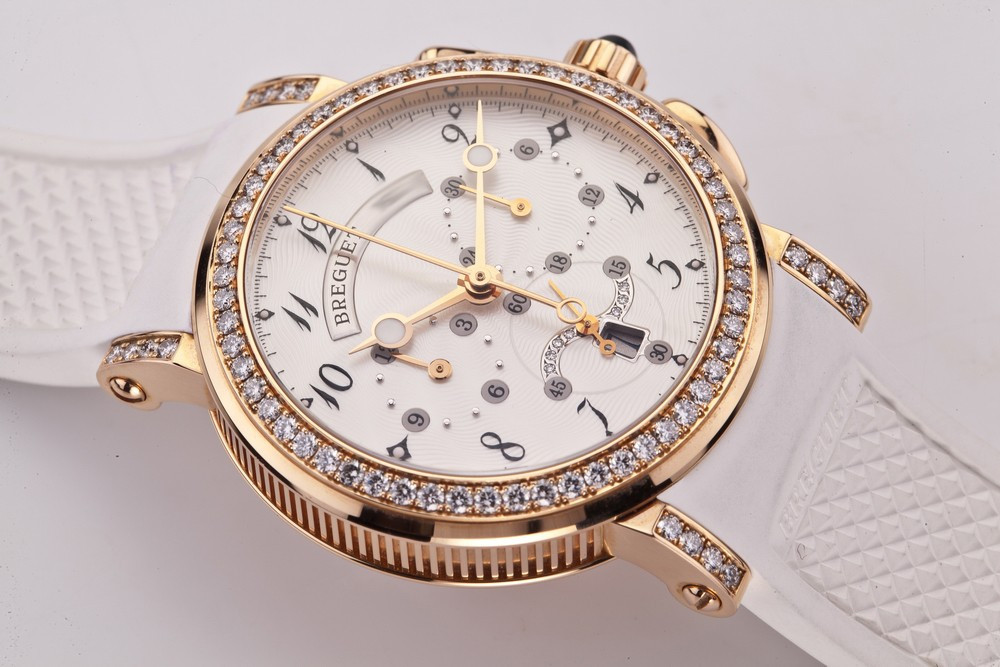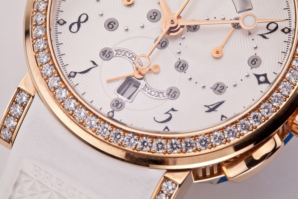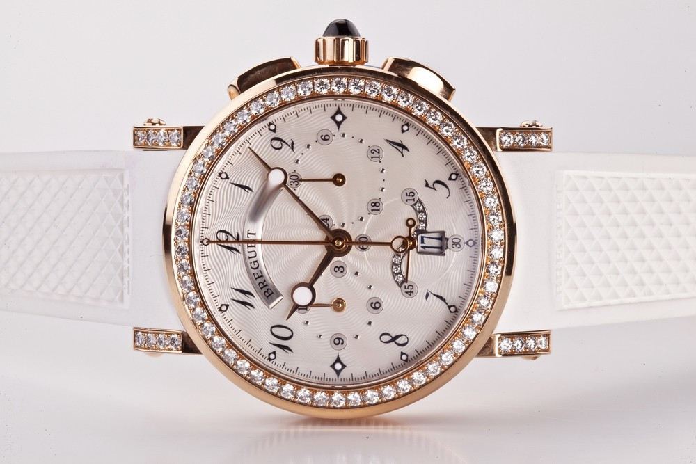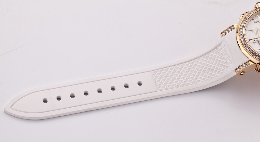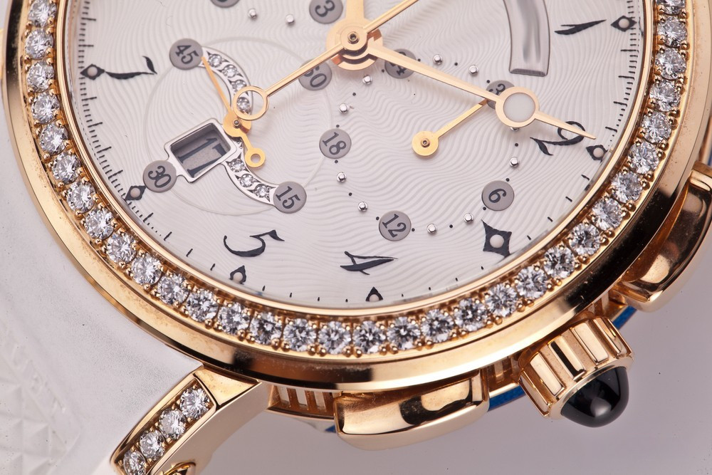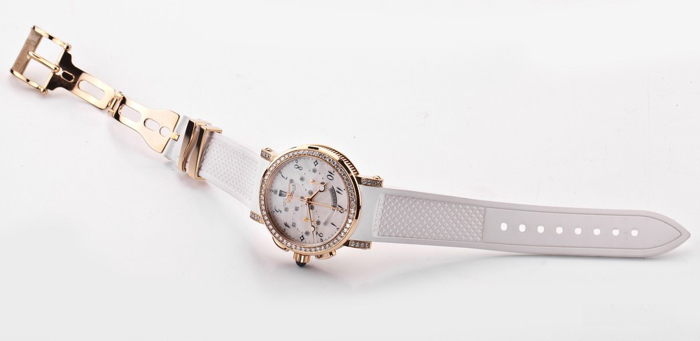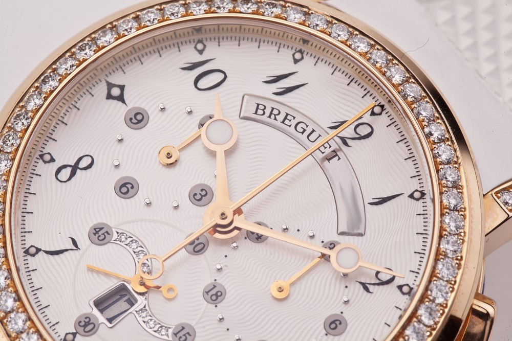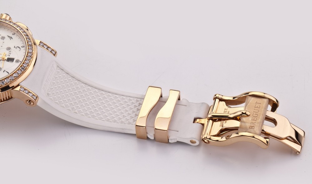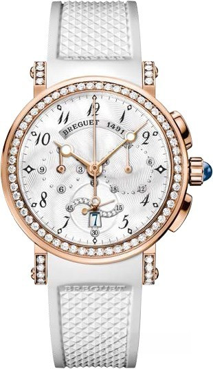 Изысканное сочетание перламутра и золота явлено в модели Marine Chronograph Ladies 8828BR/5D/586 DD00 от Breguet. Диаметр круглого корпуса из розового золота 18К равен 34,6 х 12 мм. Волнообразные золотые кнопки хронографа подчеркивают синеву сапфирового кабошона, украшающего заводную головку. Фиксированный безель и крепления для ремешка декорированы 74 бриллиантами общим весом около 1,16 карат. На циферблате с натуральным перламутровым покрытием, украшенным гильошированным узором, контрастно выделяются накладные арабские цифры в стиле Breguet. Волна из 7 бриллиантов расположена посередине малого секундного циферблата. Стрелки с окончаниями-яблоками, покрытыми люминесцентной краской, созданы из розового золота 18К. На позиции «6 часов» интегрировано окно даты, тут же расположен дополнительный секундный счетчик. Данные хронографа можно снимать по показаниям 12-ти часового субциферблата на позиции цифры 9 и 30-ти минутного счетчика в положении цифры 3, а также центральной большой секундной стрелки. Кнопка в позиции «2 часа» включает/выключает хронограф, кнопка в положении цифры 4 — обнуляет показания. Автоматический калибр 550 с 47 камнями имеет запас хода около 45 часов. Сапфировое стекло с высокой устойчивостью к появлению царапин закрывает корпус с двух сторон. Шикарный золотой ротор с узором гильоше ручной работы виден благодаря прозрачной задней крышке. Водонепроницаемость модели до 50м. Дополняет часы белоснежный ремешок из натурального каучука с золотой 18к вставкой и откидной застежкой. Часы представлены в элегантной фирменной коробке с документами.