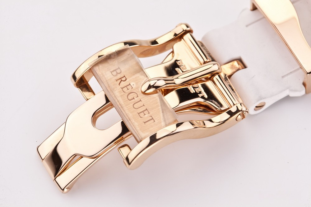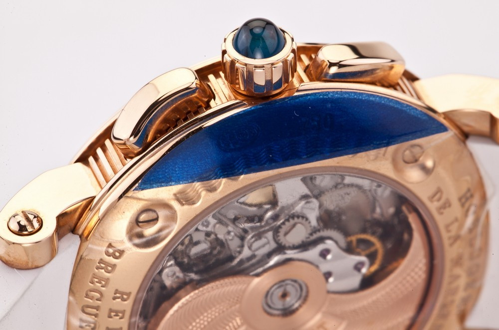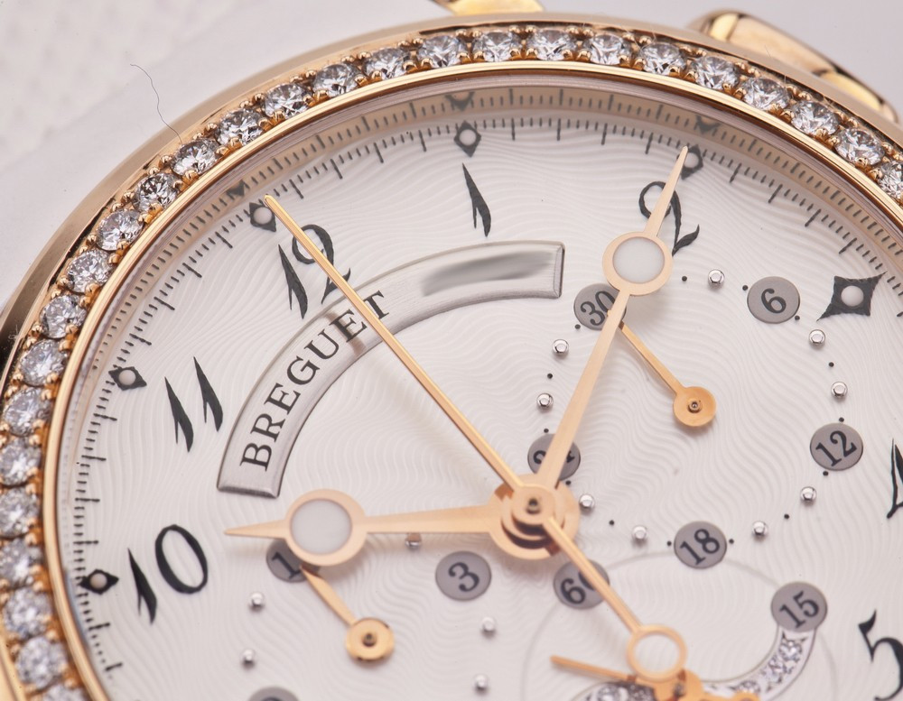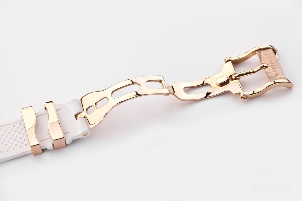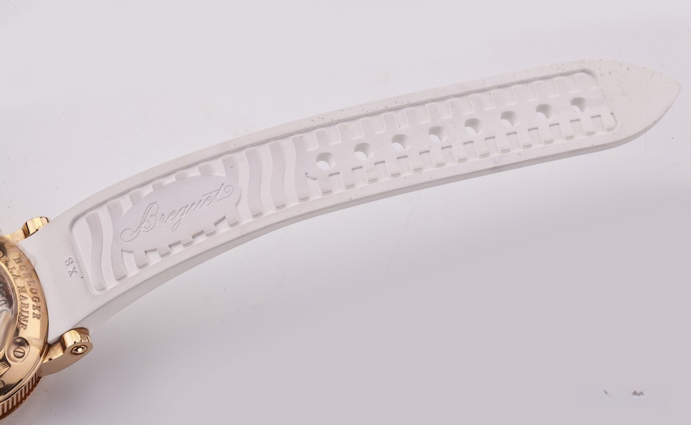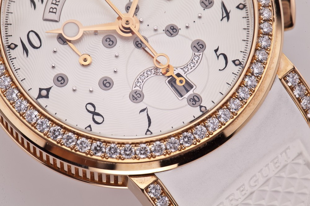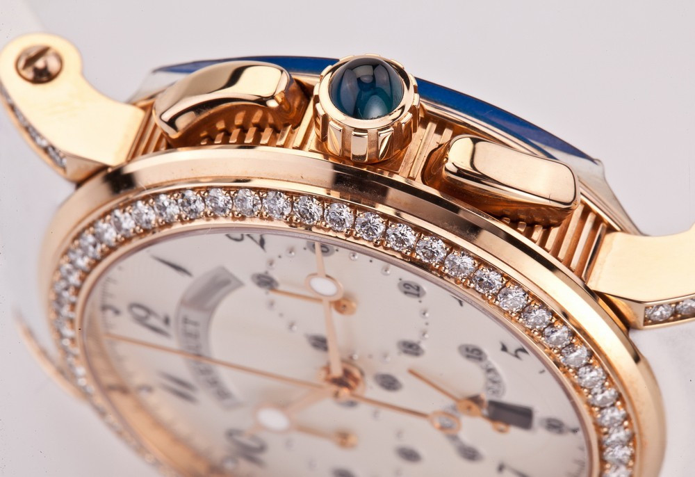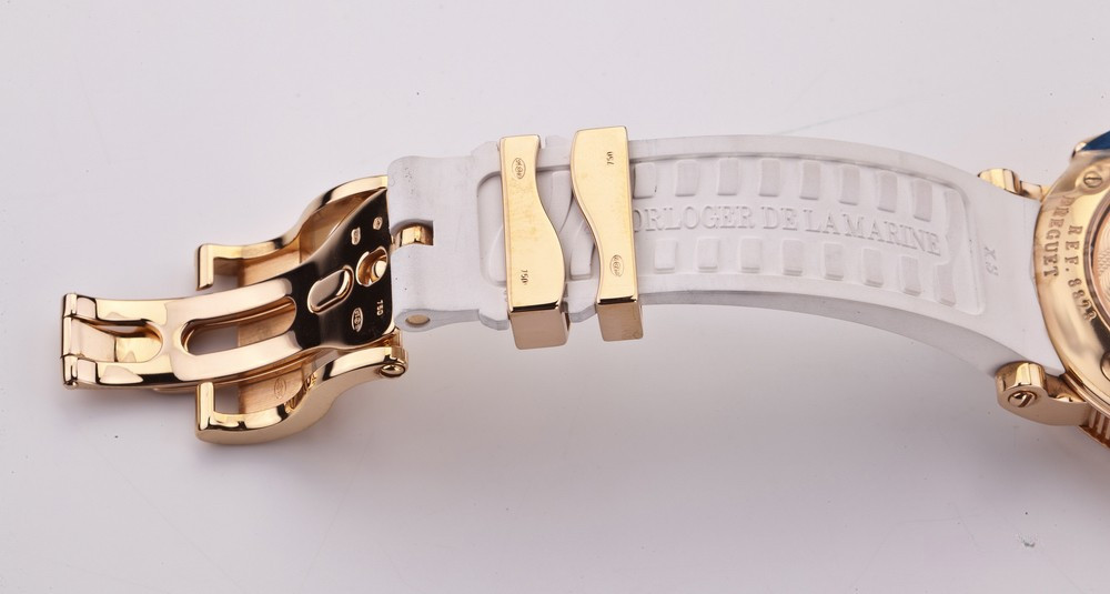 Изысканное сочетание перламутра и золота явлено в модели Marine Chronograph Ladies 8828BR/5D/586 DD00 от Breguet. Диаметр круглого корпуса из розового золота 18К равен 34,6 х 12 мм. Волнообразные золотые кнопки хронографа подчеркивают синеву сапфирового кабошона, украшающего заводную головку. Фиксированный безель и крепления для ремешка декорированы 74 бриллиантами общим весом около 1,16 карат. На циферблате с натуральным перламутровым покрытием, украшенным гильошированным узором, контрастно выделяются накладные арабские цифры в стиле Breguet. Волна из 7 бриллиантов расположена посередине малого секундного циферблата. Стрелки с окончаниями-яблоками, покрытыми люминесцентной краской, созданы из розового золота 18К. На позиции «6 часов» интегрировано окно даты, тут же расположен дополнительный секундный счетчик. Данные хронографа можно снимать по показаниям 12-ти часового субциферблата на позиции цифры 9 и 30-ти минутного счетчика в положении цифры 3, а также центральной большой секундной стрелки. Кнопка в позиции «2 часа» включает/выключает хронограф, кнопка в положении цифры 4 — обнуляет показания. Автоматический калибр 550 с 47 камнями имеет запас хода около 45 часов. Сапфировое стекло с высокой устойчивостью к появлению царапин закрывает корпус с двух сторон. Шикарный золотой ротор с узором гильоше ручной работы виден благодаря прозрачной задней крышке. Водонепроницаемость модели до 50м. Дополняет часы белоснежный ремешок из натурального каучука с золотой 18к вставкой и откидной застежкой. Часы представлены в элегантной фирменной коробке с документами.
