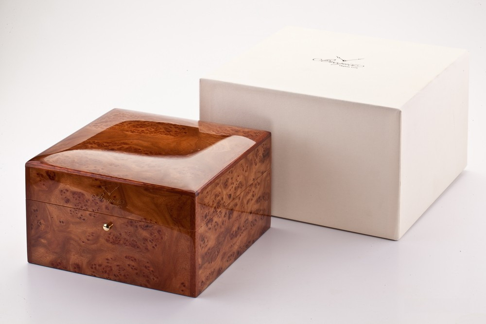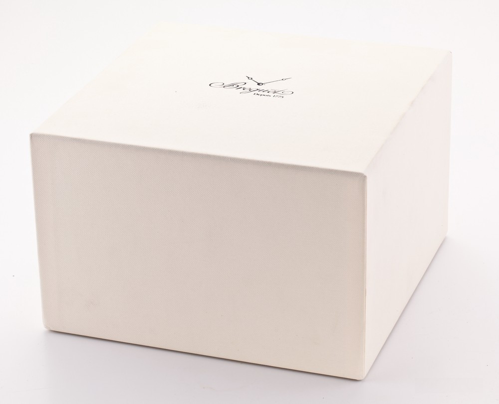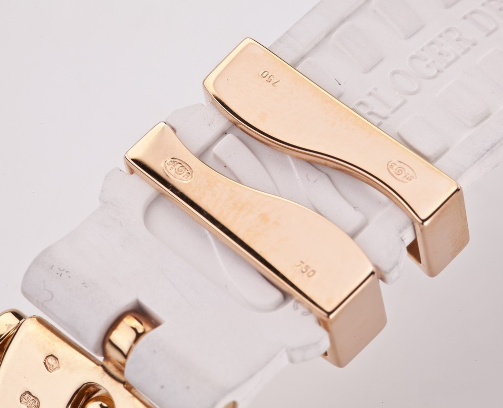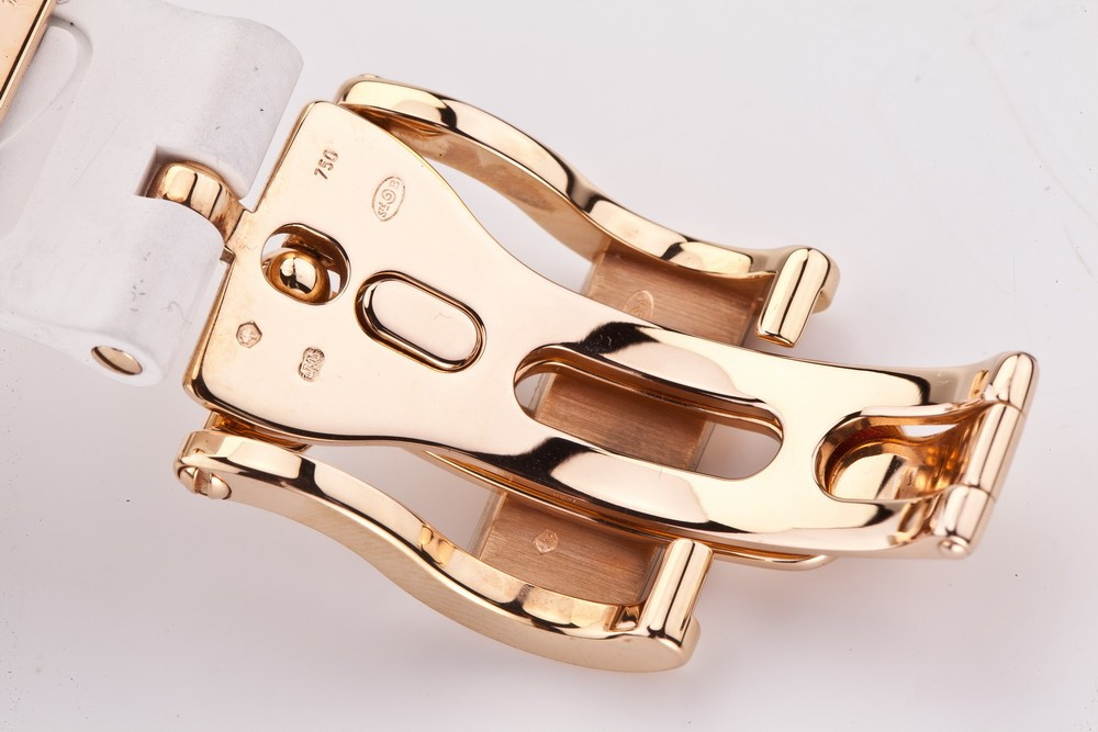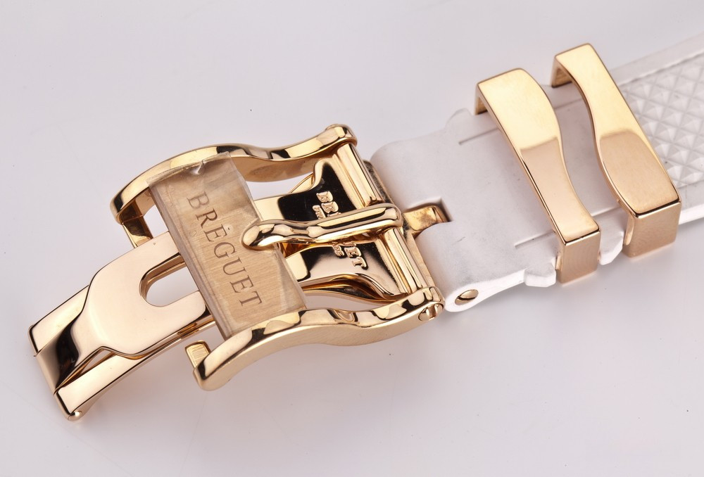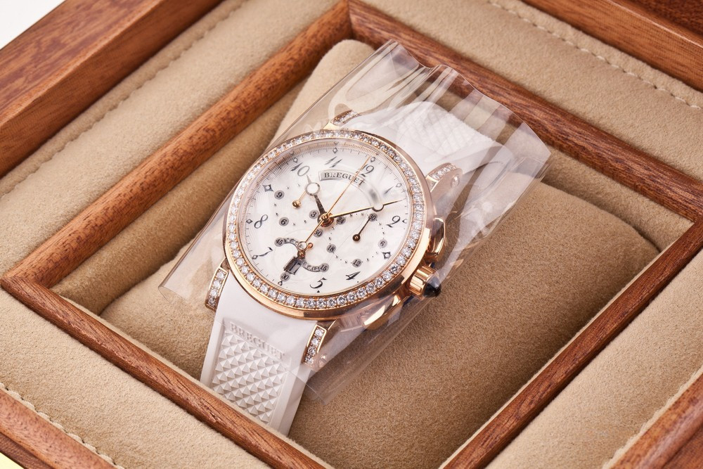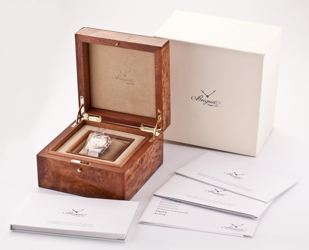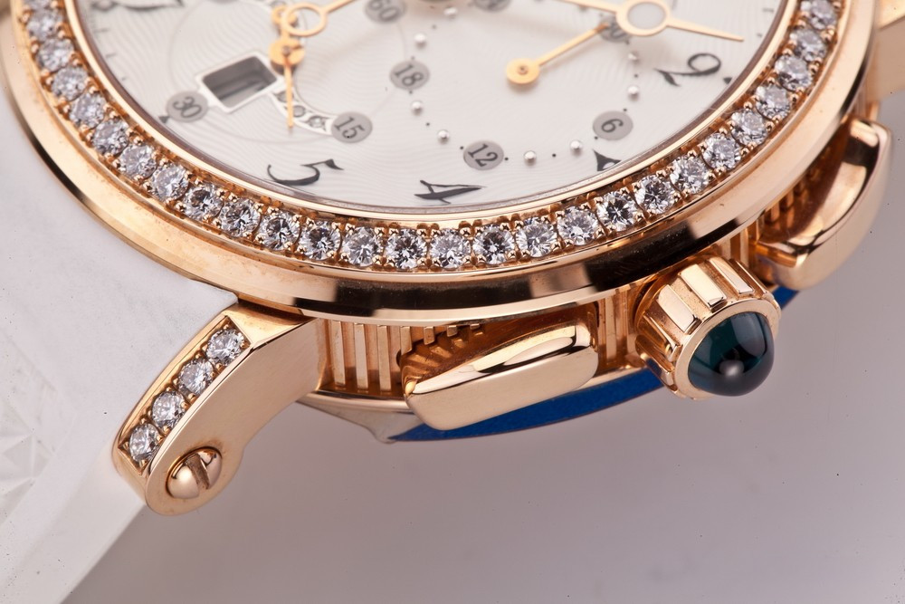 Изысканное сочетание перламутра и золота явлено в модели Marine Chronograph Ladies 8828BR/5D/586 DD00 от Breguet. Диаметр круглого корпуса из розового золота 18К равен 34,6 х 12 мм. Волнообразные золотые кнопки хронографа подчеркивают синеву сапфирового кабошона, украшающего заводную головку. Фиксированный безель и крепления для ремешка декорированы 74 бриллиантами общим весом около 1,16 карат. На циферблате с натуральным перламутровым покрытием, украшенным гильошированным узором, контрастно выделяются накладные арабские цифры в стиле Breguet. Волна из 7 бриллиантов расположена посередине малого секундного циферблата. Стрелки с окончаниями-яблоками, покрытыми люминесцентной краской, созданы из розового золота 18К. На позиции «6 часов» интегрировано окно даты, тут же расположен дополнительный секундный счетчик. Данные хронографа можно снимать по показаниям 12-ти часового субциферблата на позиции цифры 9 и 30-ти минутного счетчика в положении цифры 3, а также центральной большой секундной стрелки. Кнопка в позиции «2 часа» включает/выключает хронограф, кнопка в положении цифры 4 — обнуляет показания. Автоматический калибр 550 с 47 камнями имеет запас хода около 45 часов. Сапфировое стекло с высокой устойчивостью к появлению царапин закрывает корпус с двух сторон. Шикарный золотой ротор с узором гильоше ручной работы виден благодаря прозрачной задней крышке. Водонепроницаемость модели до 50м. Дополняет часы белоснежный ремешок из натурального каучука с золотой 18к вставкой и откидной застежкой. Часы представлены в элегантной фирменной коробке с документами.