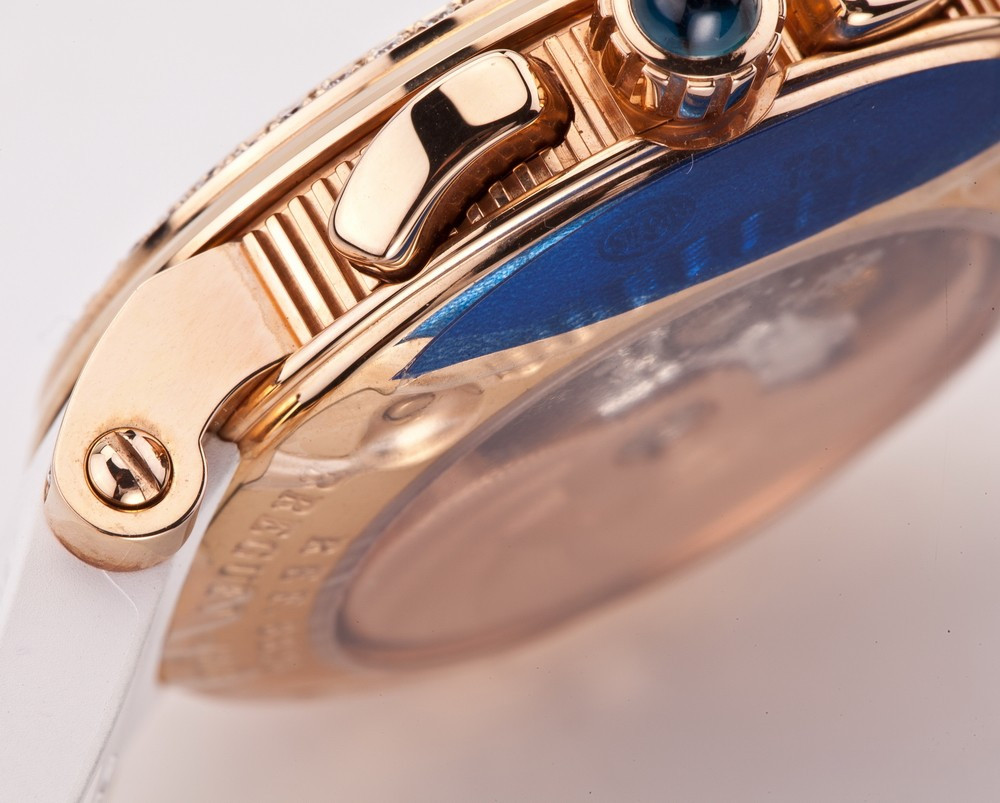 водонепроницаемость 50 м, корпус инкрустирован 74-мя белыми бриллиантами 1.16 ct., заводной ключ инкрустирован синим сапфиром кабошоном