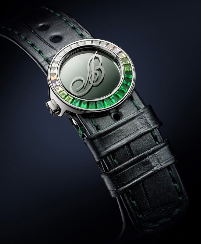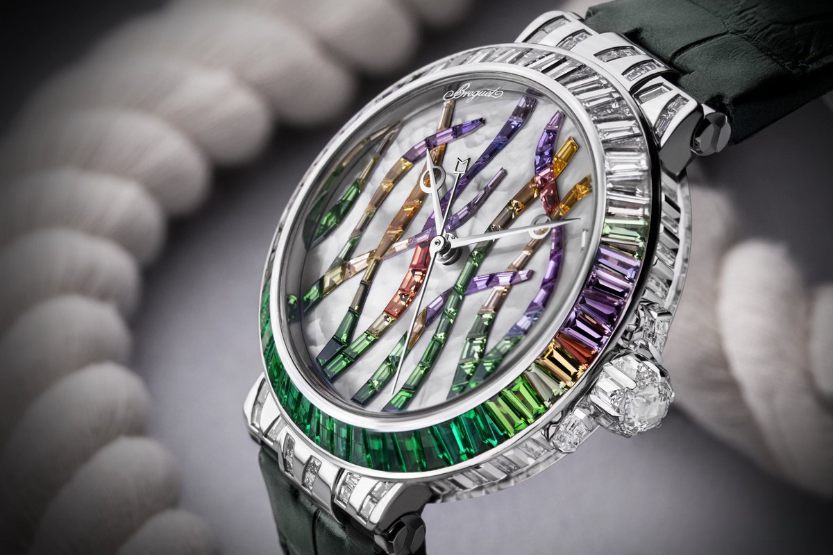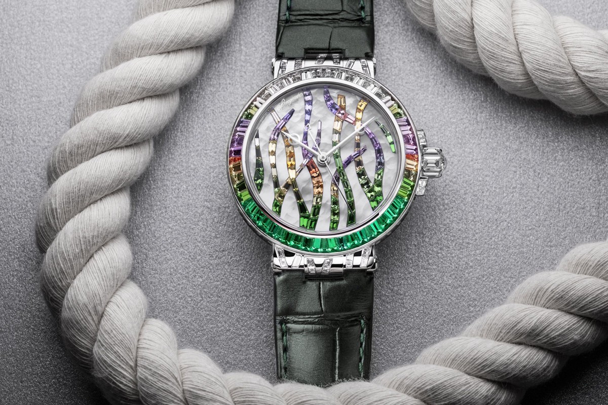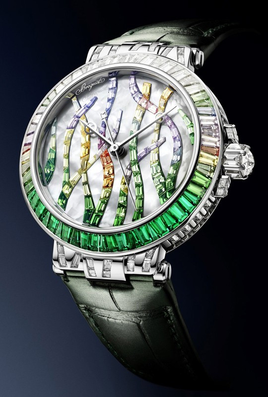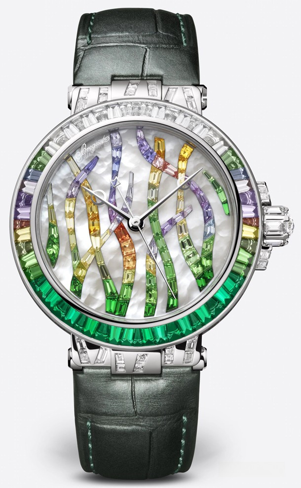 Часы Breguet Marine Haute Joaillerie 9509 Poseidonia представлены в корпусе размером 35.8 х 10.46 мм из белого золота 18к и водонепроницаемостью 30 метров. Внутри корпуса находится автоматический механизм, Калибр 591C, обладающий запасом хода 38 часов. На белом жемчужном циферблате с разноцветными багетными драгоценными камнями отображаются часы, минуты, секунды. Часы поставляются на ремешке из кожи аллигатора с вставкой из белого золота 18к. Корпус инкрустирован разноцветными багетными драгоценными камнями.