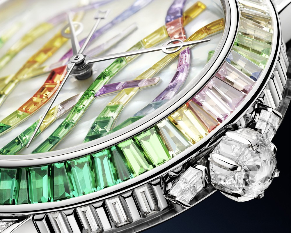 водонепроницаемость 30 м, корпус инкрустирован разноцветными багетными драгоценными камнями