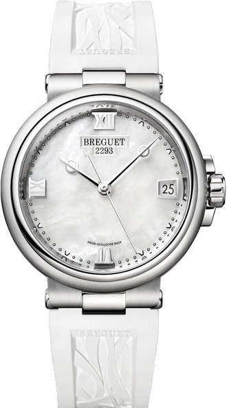 Часы Breguet Marine 9517 представлены в корпусе из нержавеющей стали размером 33.8 х 9.89 мм и водонепроницаемостью 50 метров. Внутри корпуса установлен автоматический механизм, Калибр 591A, обладающий запасом хода 38 часов. На белом жемчужном циферблате отображаются часы, минуты, секунды и дата. Часы поставляются на каучуковом ремешке с вставкой из нержавеющей стали.
