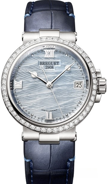 Часы Breguet Marine 9518 представлены в корпусе из белого золота 18к размером 33.8 х 9.89 мм и водонепроницаемостью 50 метров. Внутри корпуса установлен автоматический механизм, Калибр 591A, обладающий запасом хода 38 часов. На голубом жемчужном гильошированном циферблате отображаются часы, минуты, секунды и дата. Часы поставляются на ремешке из кожи аллигатора с вставкой из белого золота 18к. Безель из белых бриллиантов.