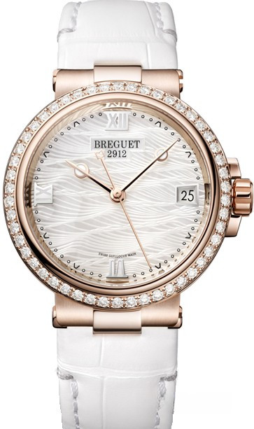 Часы Breguet Marine 9518 представлены в корпусе из розового золота 18к размером 33.8 х 9.89 мм и водонепроницаемостью 50 метров. Внутри корпуса установлен автоматический механизм, Калибр 591A, обладающий запасом хода 38 часов. На белом жемчужном гильошированном циферблате отображаются часы, минуты, секунды и дата. Часы поставляются на ремешке из кожи аллигатора с вставкой из розового золота 18к. Безель из белых бриллиантов.
