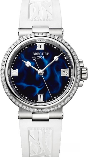 Часы Breguet Marine 9518 представлены в корпусе из нержавеющей стали размером 33.8 х 9.89 мм и водонепроницаемостью 50 метров. Внутри корпуса установлен автоматический механизм, Калибр 591A, обладающий запасом хода 38 часов. На синем жемчужном циферблате отображаются часы, минуты, секунды и дата. Часы поставляются на каучуковом ремешке с вставкой из нержавеющей стали. Безель из белых бриллиантов.