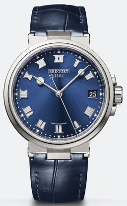 Часы Breguet Marine 5517 представлены в корпусе размером 40 х 11.5 мм из титана. На синем циферблате отображаются часы, минуты, секунды, дата. Внутри корпуса установлен автоматический механизм, Калибр 777A с запасом хода 55 часов. Часы поставляются на ремешке из кожи аллигатора с вставкой из титана. Водонепроницаемость 100 метров.