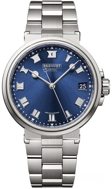 Часы Breguet Marine 5517 представлены в корпусе размером 40 х 11.5 мм из титана. На синем циферблате отображаются часы, минуты, секунды, дата. Внутри корпуса установлен автоматический механизм, Калибр 777A с запасом хода 55 часов. Часы поставляются на браслете из титана. Водонепроницаемость 100 метров.