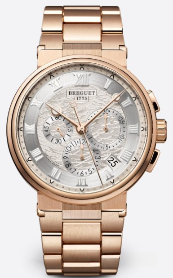 Часы Breguet Marine 5527 представлены в корпусе размером 42.3 х 13.85 мм из розового золота 18к. На серебристом гильошированном циферблате отображаются часы, минуты, секунды, дата, накопители хронографа. Внутри корпуса установлен автоматический механизм, Калибр 582QA с запасом хода 48 часов. Часы поставляются на браслете из розового золота 18к. Водонепроницаемость 100 метров.