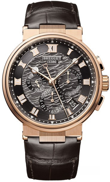 Часы Breguet Marine 5527 представлены в корпусе размером 42.3 х 13.85 мм из розового золота 18к. На коричневом гильошированном циферблате отображаются часы, минуты, секунды, дата, накопители хронографа. Внутри корпуса установлен автоматический механизм, Калибр 582QA с запасом хода 48 часов. Часы поставляются на ремешке из кожи аллигатора с вставкой из розового золота 18к. Водонепроницаемость 100 метров.