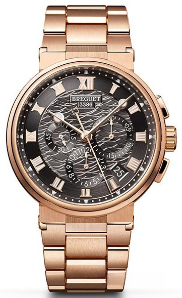 Часы Breguet Marine 5527 представлены в корпусе размером 42.3 х 13.85 мм из розового золота 18к. На коричневом гильошированном циферблате отображаются часы, минуты, секунды, дата, накопители хронографа. Внутри корпуса установлен автоматический механизм, Калибр 582QA с запасом хода 48 часов. Часы поставляются на браслете из розового золота 18к. Водонепроницаемость 100 метров.