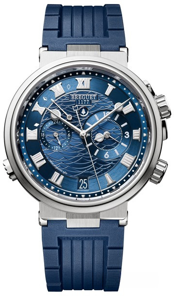 Часы с будильником Breguet Marine 5547 представлены в корпусе размером 40 мм из белого золота 18к. На синем циферблате отображаются часы, минуты, секунды, дата. Внутри корпуса установлен автоматический механизм, Калибр 519F/1 с запасом хода 45 часов. Часы поставляются на ремешке из каучука с вставкой из белого золота 18к. Водонепроницаемость 100 метров.