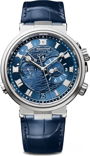 Часы с будильником Breguet Marine 5547 представлены в корпусе размером 40 мм из белого золота 18к. На синем гильошированном циферблате отображаются часы, минуты, секунды, дата. Внутри корпуса установлен автоматический механизм, Калибр 519F/1 с запасом хода 45 часов. Часы поставляются на ремешке из кожи аллигатора с вставкой из белого золота 18к. Водонепроницаемость 50 метров.