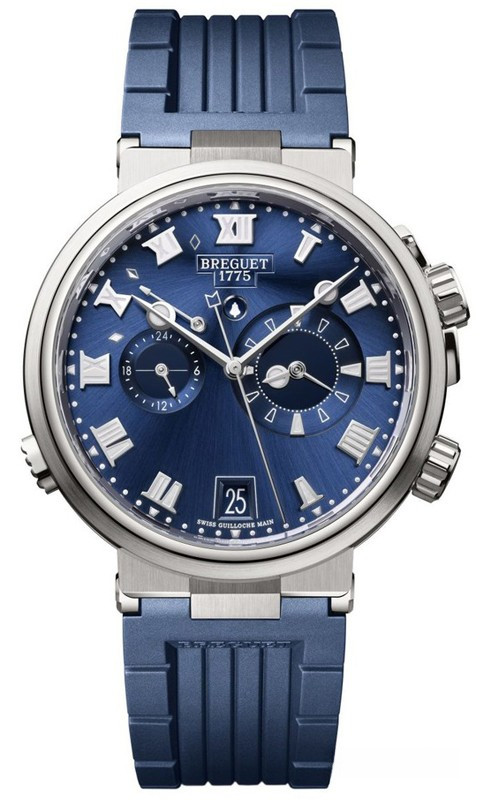 Часы с будильником Breguet Marine 5547 представлены в корпусе размером 40 мм из титана. На синем циферблате отображаются часы, минуты, секунды, дата. Внутри корпуса установлен автоматический механизм, Калибр 519F/1 с запасом хода 45 часов. Часы поставляются на каучуковом ремешке с титановой вставкой. Водонепроницаемость 100 метров.