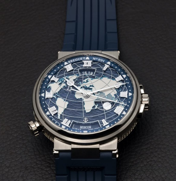 Часы Breguet Marine 5557 Hora Mundi представлены в корпусе из белого золота 18к размером 43.9 x 13.8 мм водонепроницаемостью 100 метров. Внутри корпуса установлен автоматический механизм, Калибр Breguet 77F1, обладающий запасом хода 55 часов. На синем циферблате отображаются часы, минуты, секунды, дата, название города. Часы комплектуются каучуковым ремешком с золотой застежкой.