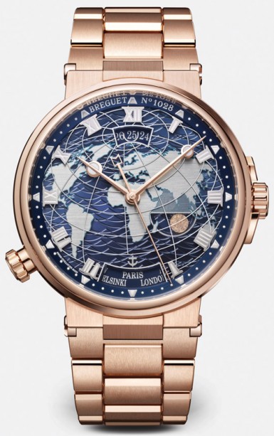 Часы Breguet Marine 5557 Hora Mundi представлены в корпусе из белого золота 18к размером 43.9 x 13.8 мм водонепроницаемостью 100 метров. Внутри корпуса установлен автоматический механизм, Калибр Breguet 77F1, обладающий запасом хода 55 часов. На синем циферблате отображаются часы, минуты, секунды, дата, название города. Часы комплектуются ремешком из кожи аллигатора с золотой застежкой.