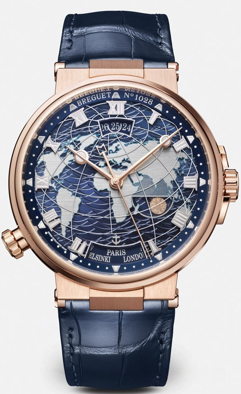 Часы Breguet Marine 5557 Hora Mundi представлены в корпусе из розового золота 18к размером 43.9 x 13.8 мм водонепроницаемостью 100 метров. Внутри корпуса установлен автоматический механизм, Калибр Breguet 77F1, обладающий запасом хода 55 часов. На синем циферблате отображаются часы, минуты, секунды, дата, название города. Часы комплектуются ремешком из кожи аллигатора с золотой застежкой.