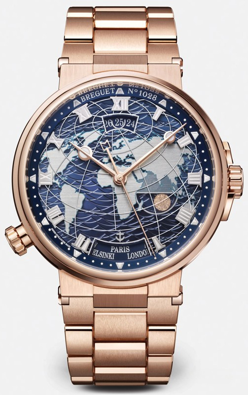 Часы Breguet Marine 5557 Hora Mundi представлены в корпусе из розового золота 18к размером 43.9 x 13.8 мм водонепроницаемостью 100 метров. Внутри корпуса установлен автоматический механизм, Калибр Breguet 77F1, обладающий запасом хода 55 часов. На синем циферблате отображаются часы, минуты, секунды, дата, название города. Часы комплектуются браслетом из розового золота 18к.