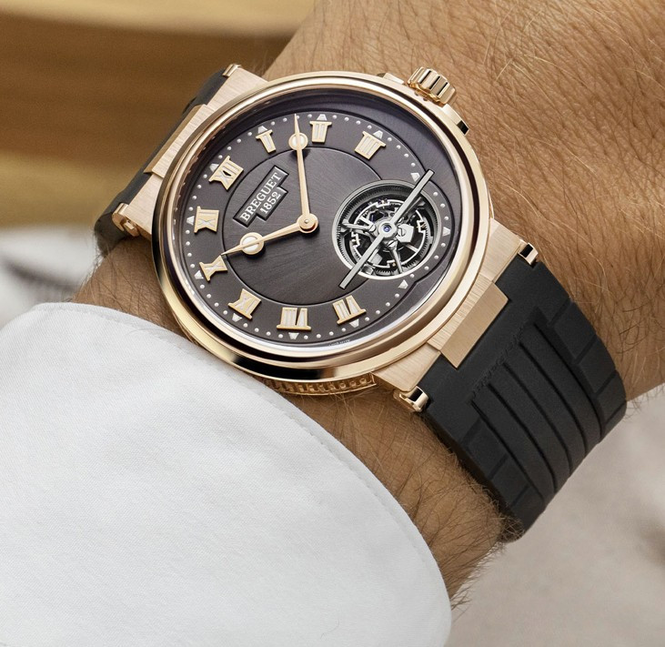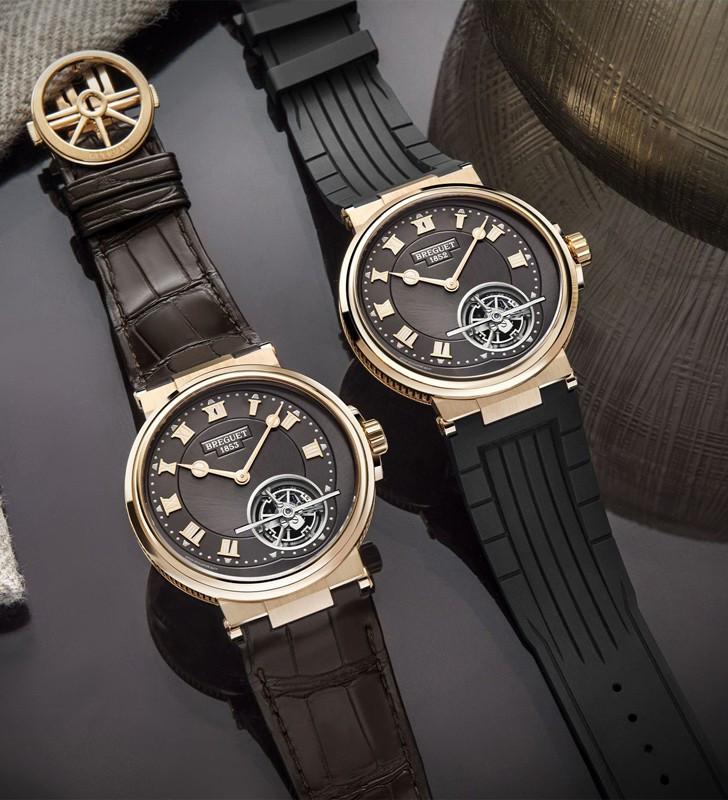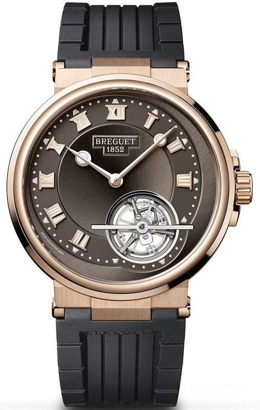 Часы Breguet Marine 5577 представлены в корпусе размером 42.5 х 9.35 мм из розового золота 18к водонепроницаемостью 100 метров. Внутри корпуса установлен автоматический механизм, Калибр 581, обладающий запасом хода 80 часов. На коричневом циферблате отображаются часы, минуты, секунды. Часы поставляются на каучуковом ремешке с золотой затежкой.