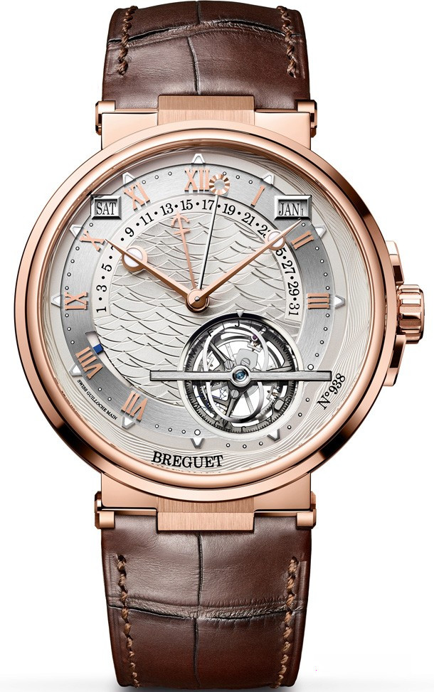 Корпус часового механизма из розового золота 18к с изящно рифленым корпусным кольцом. Задняя крышка из сапфирового стекла. Диаметр 43,9 мм. Водонепроницаемость до 10 бар (100 м). Серебристый гильошированный циферблат. Индивидуальный номер и надпись Breguet Часовая шкала представлена римскими цифрами и люминесцентными метками. Стрелки Breguet из 18-каратного золота с добавлением люминесцентных материалов. Идущая стрелка солнечного времени с граненым золотым солнцем. Дни недели указываются в круглом окошке, расположенном в положении между «10 часов» и «11 часов». Месяцы и цикл високосного года указываются в круглом окошке, расположенном в положении между «1 час» и «2 часа». Ретроградный указатель дат двигается по дуге с положения «9 часов» до «3 часа». Запас хода указан в круглом окошке, расположенном в положении между «7 часов» и «9 часов». Механизм с автоподзаводом и уравнением времени, вечный календарь, турбийон и 80 часов запаса, калибр 581DPE. Номер и надпись Breguet Малая секундная стрелка и кулачок уравнения времени на оси турбийона. 16¾ линий. 57 камней. Кремниевое анкерное колесо и перевернутый спуск с кремниевыми анкерами. Кремниевая спираль. Частота колебаний балансира составляет 4 Гц. Механизм отрегулирован в 6 положениях. Ремешок из крокодиловой кожи с золотой застежкой-клипсой.