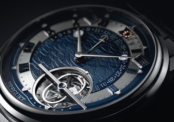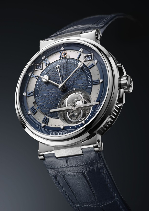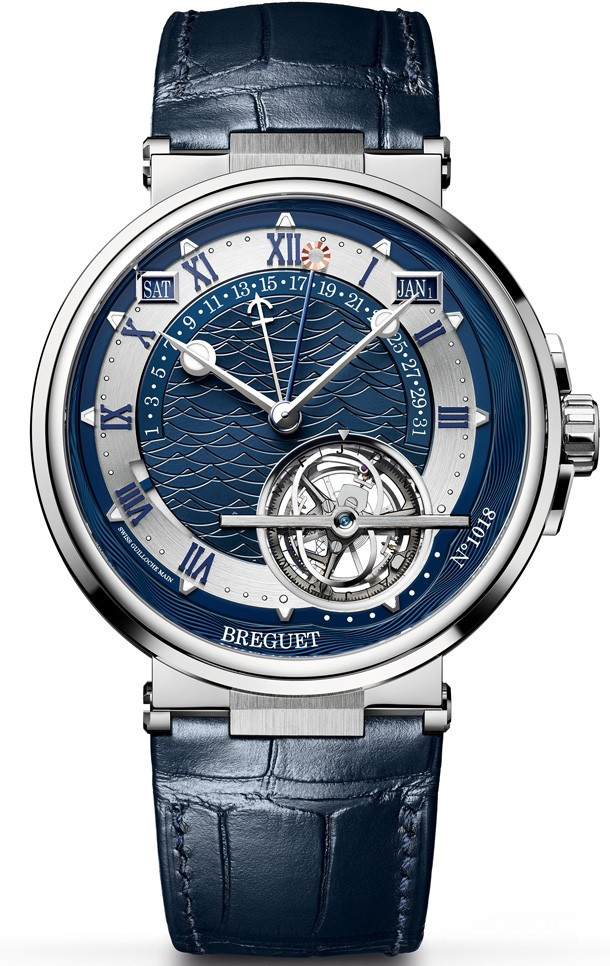 Корпус часового механизма из платины 950 пробы с изящно рифленым корпусным кольцом. Задняя крышка из сапфирового стекла. Диаметр 43,9 мм. Водонепроницаемость до 10 бар (100 м). Синий циферблат в золоте, гильошированный. Индивидуальный номер и надпись Breguet Часовая шкала представлена римскими цифрами и люминесцентными метками. Стрелки Breguet из 18-каратного золота с добавлением люминесцентных материалов. Идущая стрелка солнечного времени с граненым золотым солнцем. Дни недели указываются в круглом окошке, расположенном в положении между «10 часов» и «11 часов». Месяцы и цикл високосного года указываются в круглом окошке, расположенном в положении между «1 час» и «2 часа». Ретроградный указатель дат двигается по дуге с положения «9 часов» до «3 часа». Запас хода указан в круглом окошке, расположенном в положении между «7 часов» и «9 часов». Механизм с автоподзаводом и уравнением времени, вечный календарь, турбийон и 80 часов запаса, калибр 581DPE. Номер и надпись Breguet Малая секундная стрелка и кулачок уравнения времени на оси турбийона. 16¾ линий. 57 камней. Кремниевое анкерное колесо и перевернутый спуск с кремниевыми анкерами. Кремниевая спираль. Частота колебаний балансира составляет 4 Гц. Механизм отрегулирован в 6 положениях. Ремешок из крокодиловой кожи с золотой застежкой-клипсой.
