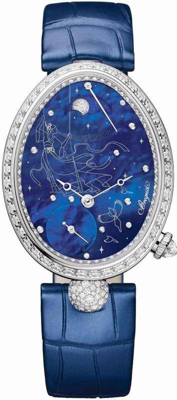 Часы Breguet Reine de Naples 8905 представлены в корпусе из белого золота 18к размером 36.5 х 28.45 мм водонепроницаемостью 30 метров. Внутри корпуса находится автоматический механизм, Калибр 537DRL2, обладающий запасом хода 45 часов. На синем циферблате с белыми бриллиантами отображаются часы, минуты, секунды, фаза луны, запас хода. Часы поставляются на ремешке из кожи аллигатора с золотой застежкой. Корпус инкрустирован белыми бриллиантами.