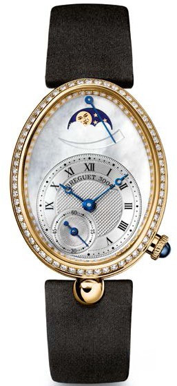 Часы Breguet Reine de Naples 8908 8908BA/52/864 D00D выпущены в корпусе из желтого золота 18к, размером 28.45 х 36.5 х 10.05 мм и водонепроницаемостью 30 м с безелем из 128-ми белых бриллиантов 0.83 ct. и заводной головкой, инкрустированной синим сапфиром кабошоном. Внутри корпуса установлен автоматический механизм, Калибр 537 DRL1. На белом жемчужном с серебристым гильошированном циферблате отображаются часы, минуты, секунды, фаза луны, запас хода. Запас хода 40 часов. Часы комплектуются атласным ремешком с золотой 18к вставкой и раскладывающейся застежкой.