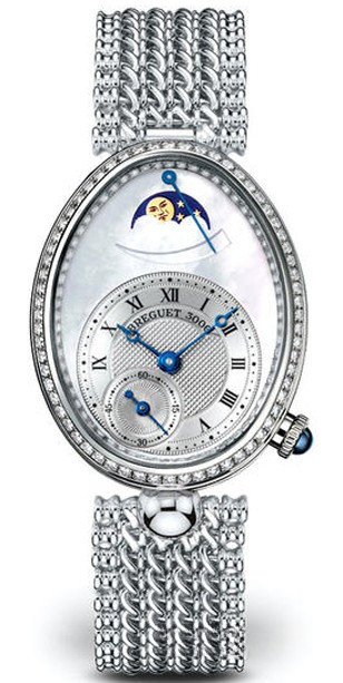 Часы Breguet Reine de Naples выпущены в корпусе из белого золота 18к, размером 28.45 х 36.5 х 10.05 мм и водонепроницаемостью 30 м, инкрустированном 128-ю белыми бриллиами и заводной головкой, инкрустированной синим сапфиром кабошоном. Внутри корпуса установлен автоматический механизм, Калибр 537 DRL1. На белом жемчужном с серебристым гильошированном циферблате отображаются часы, минуты, секунды, фаза луны, запас хода. Запас хода 40 часов. Часы комплектуются браслетом из белого золота 18к.