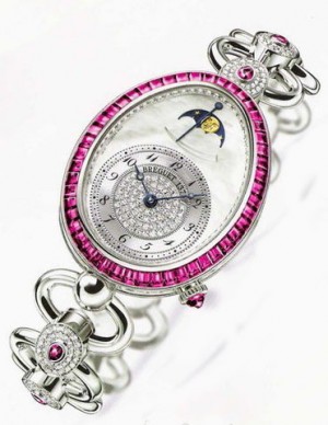 Часы Breguet Reine de Naples 8909BB/5D/J21 RRRR выпущены в корпусе из белого золота 18к, размером 30.45 х 38.5 х 10.05 мм и водонепроницаемостью 30 м, инкрустированным 38-ю белыми багетными бриллиантами 2.8 ct. и 48-ю багетными рубинами 4.31ct. Внутри корпуса установлен автоматический механизм, Калибр 537 DRL1. На белом жемчужном циферблате с 67-ю белыми бриллиантами 0.168 ct. отображаются часы, минуты, запас хода, фаза луны. Запас хода 40 часов. Часы комплектуются браслетом из белого золота18к, инкрустированным 371-м белым бриллиантом 1.949 ct. и 11-ю рубинами 1.56 ct.