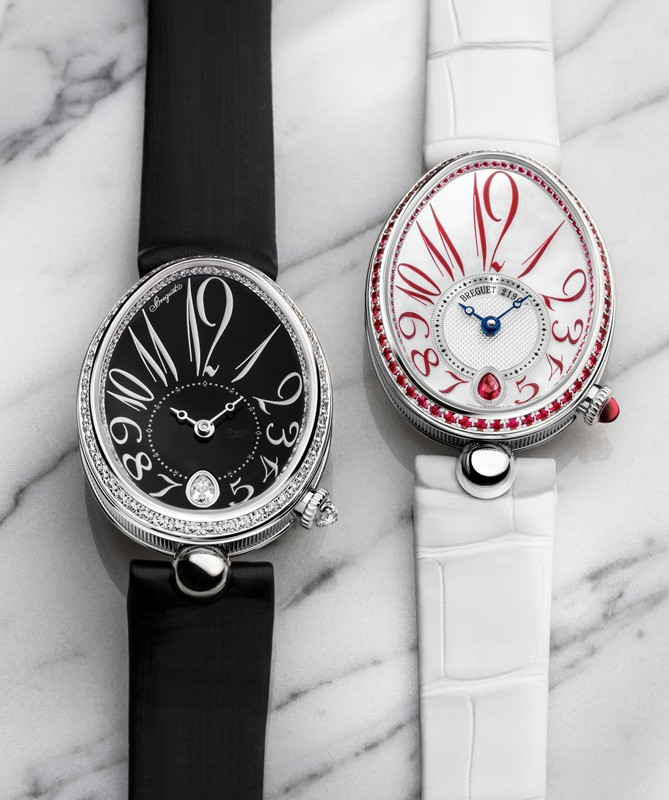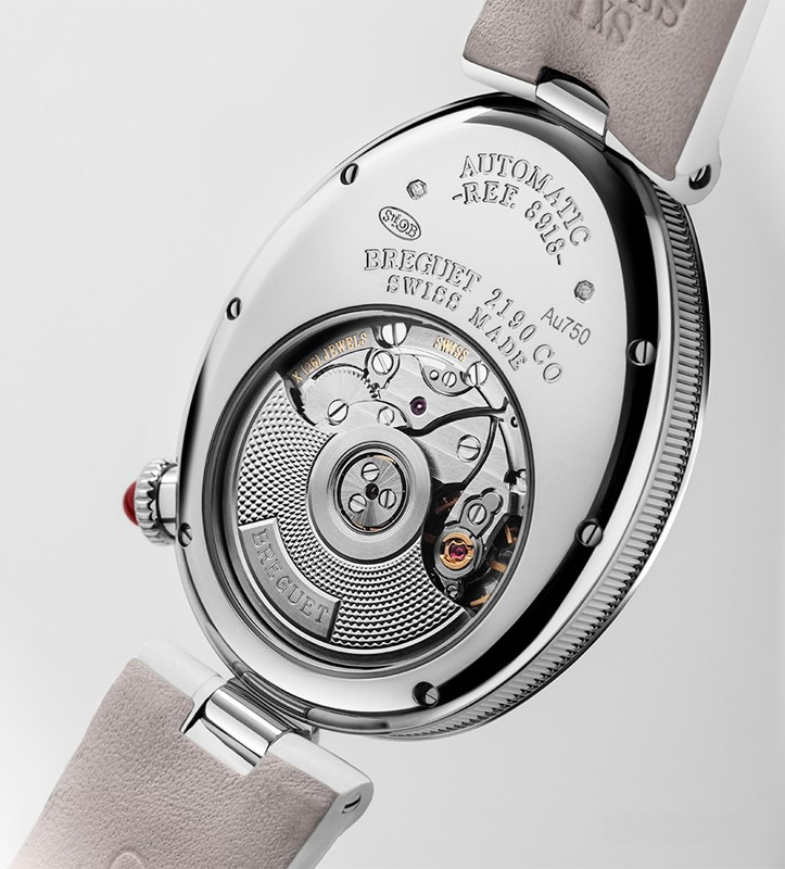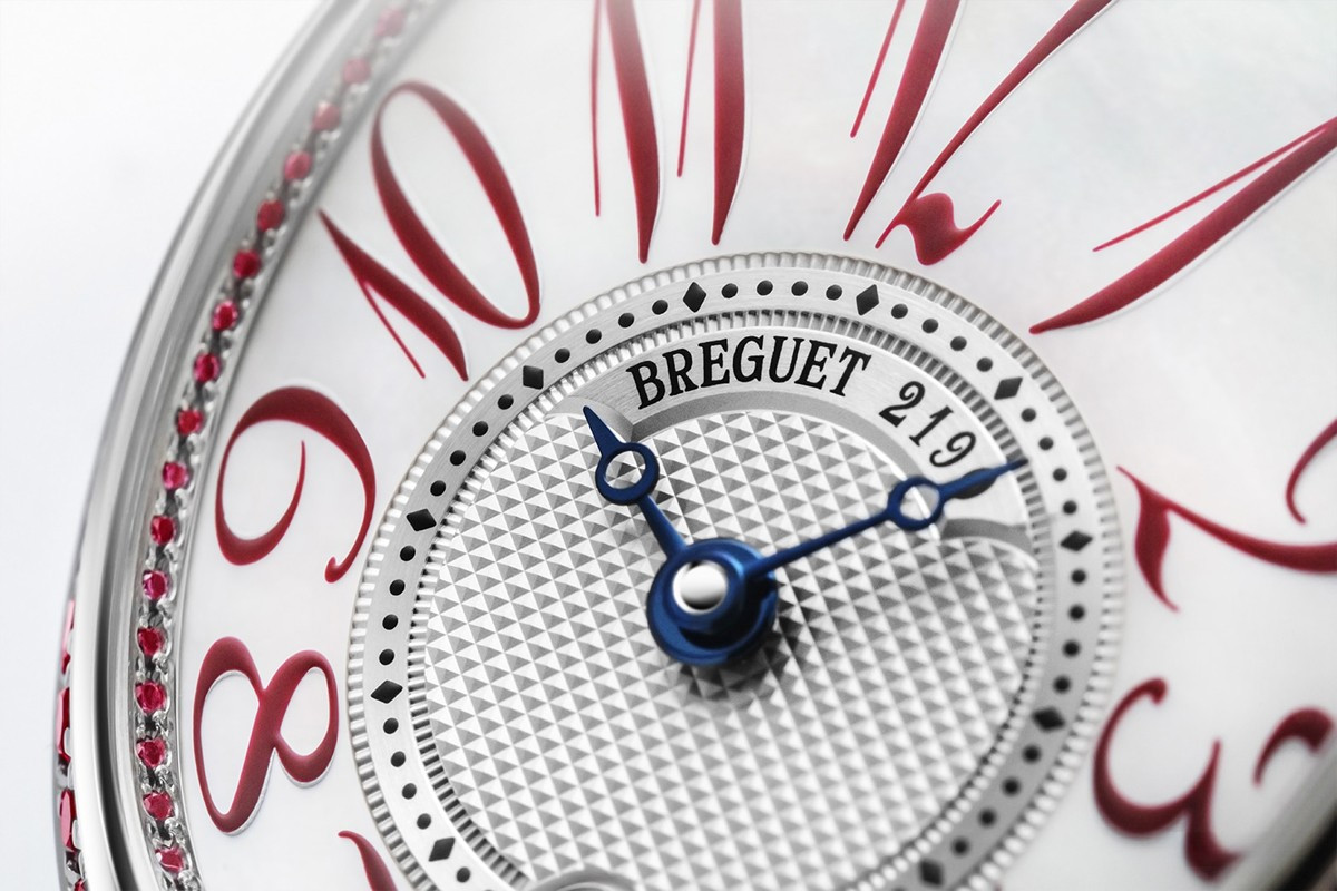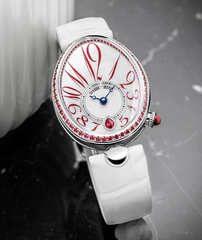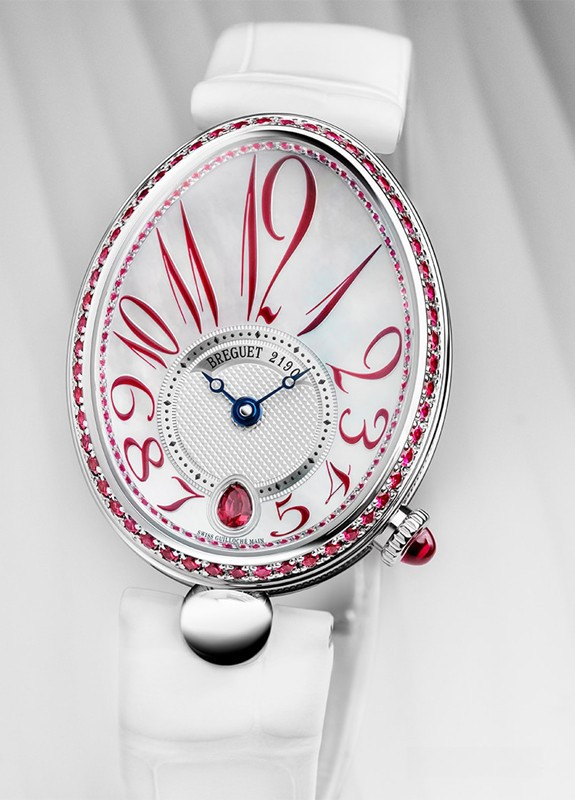 Корпус часового механизма из 18-каратного белого золота с изящно рифленым корпусным кольцом. Безель из красных рубинов. Заводная головка инкрустирована рубином огранки ""бриолет"" (весом около 0,26 карат). Задняя крышка из сапфирового стекла. Размеры: 36,5 x 28,45 мм. Водонепроницаемость до 30 м. Циферблат белого жемчужного цвета. Индивидуальный номер и надпись Breguet. Часовая шкала представлена арабскими цифрами Breguet, смещающимися к положению «6 часов». На отметке «6 часов» расположен рубин грушевидной огранки весом около 0,09 карат. Стрелки Breguet с открытым наконечником из вороненой стали. Механизм с автоподзаводом, Калибр 537/3. Номер и надпись Breguet 8¾ линий. 26 камней. Запас хода 45 часов. Анкерное колесо и однорядный швейцарский спусковой механизм из кремния. Кремниевая спираль. Частота колебаний балансира составляет 3,5 Гц. Механизм отрегулирован в 6 положениях. Ремешок из кожи аллигатора с золотой застежкой.