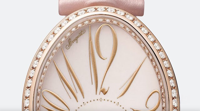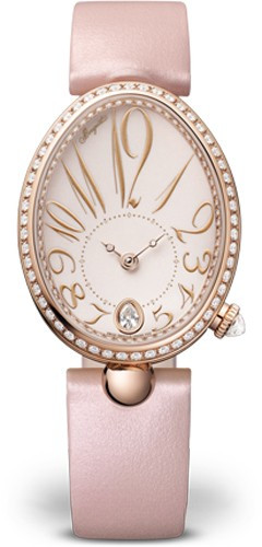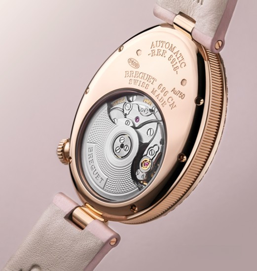Корпус часов из 18-каратного розового золота с изящно рифленым корпусным кольцом. Безель из белых бриллиантов. Заводная головка инкрустирована бриллиантом огранки ""бриолет"" (весом около 0,26 карат). Задняя крышка из сапфирового стекла. Размеры: 36,5 x 28,45 мм. Водонепроницаемость до 30 м. Циферблат бежевого цвета. Индивидуальный номер и надпись Breguet. Часовая шкала представлена арабскими цифрами Breguet, смещающимися к положению «6 часов». На отметке «6 часов» расположен бриллиант грушевидной огранки весом около 0,09 карат. Стрелки Breguet с открытым наконечником из рохового золота. Механизм с автоподзаводом, Калибр 537/1. Номер и надпись Breguet 8¾ линий. 26 камней. Запас хода 45 часов. Анкерное колесо и однорядный швейцарский спусковой механизм из кремния. Кремниевая спираль. Частота колебаний балансира составляет 3,5 Гц. Механизм отрегулирован в 6 положениях. Ремешок сатиновый с золотой застежкой.