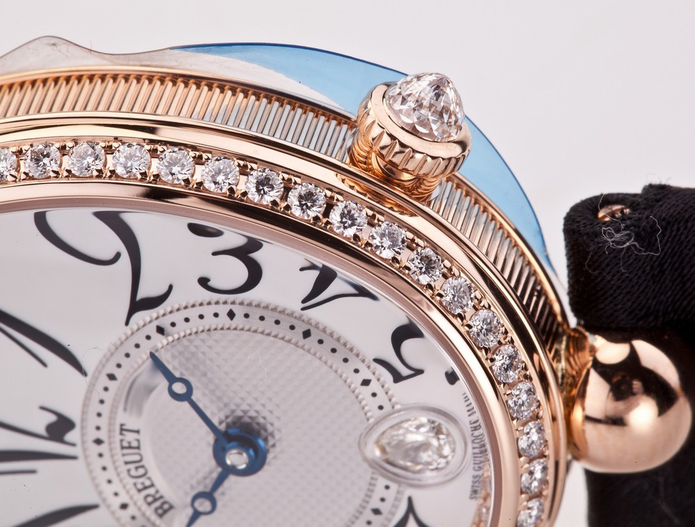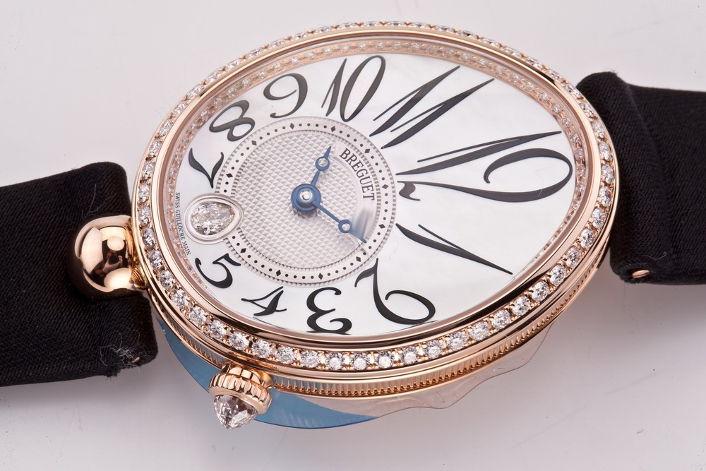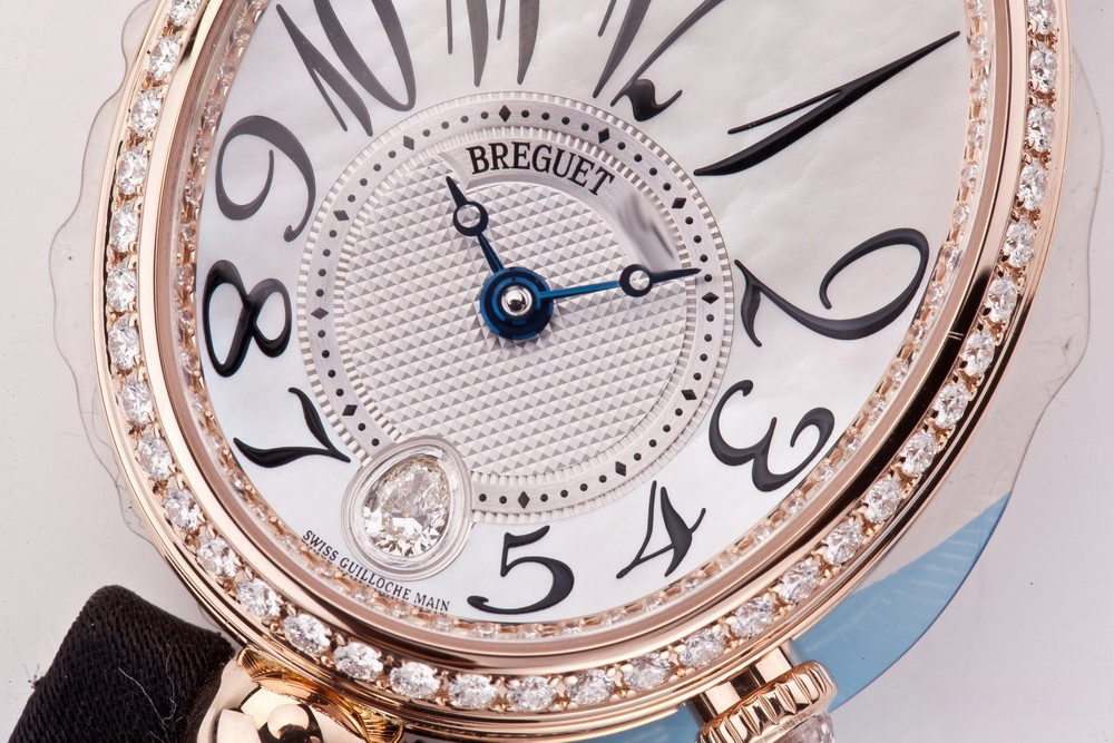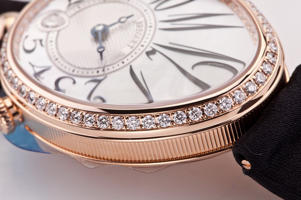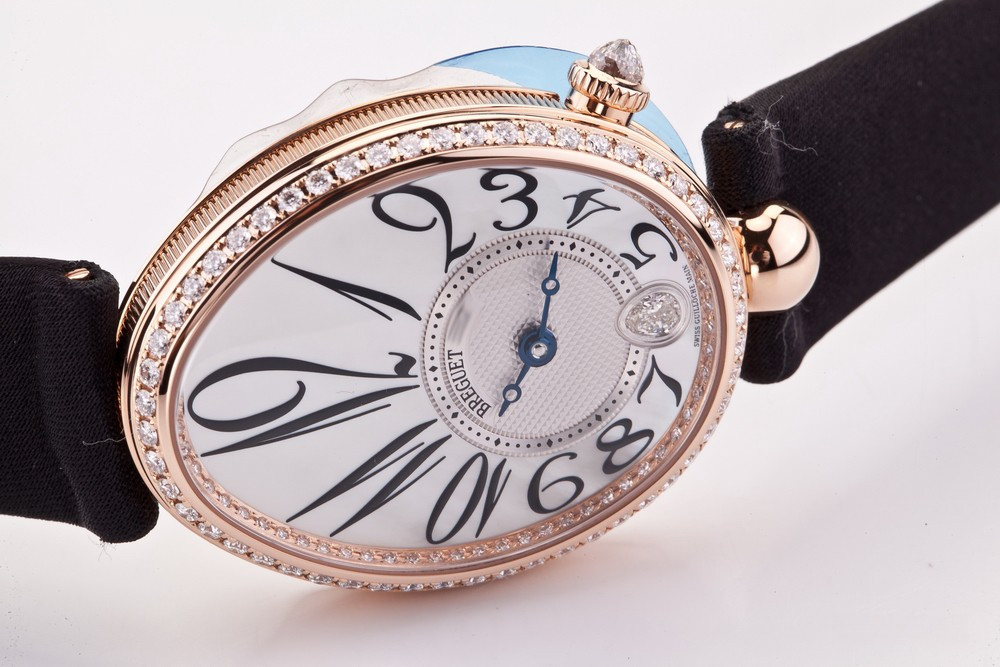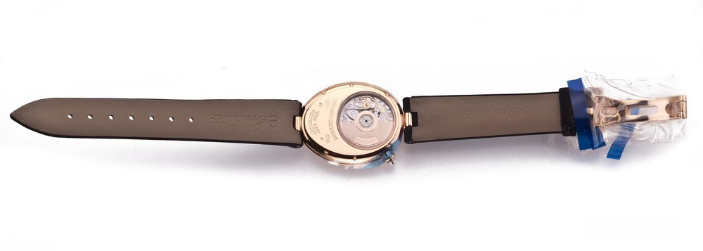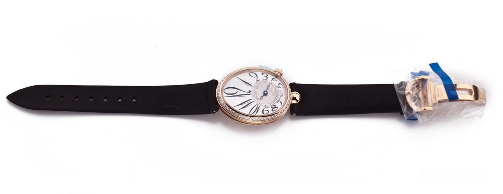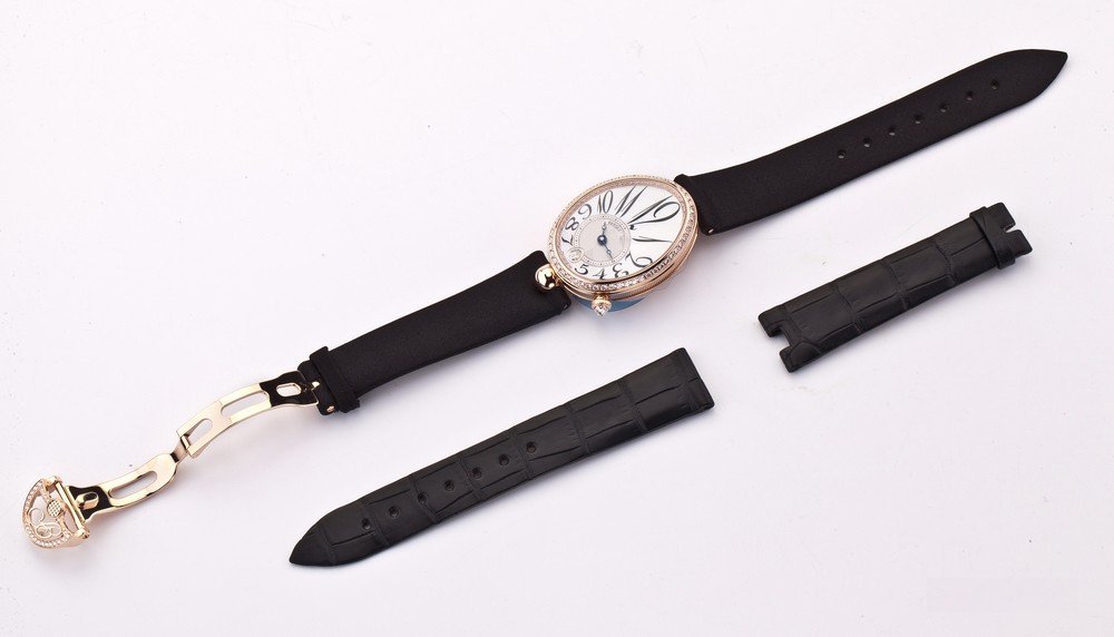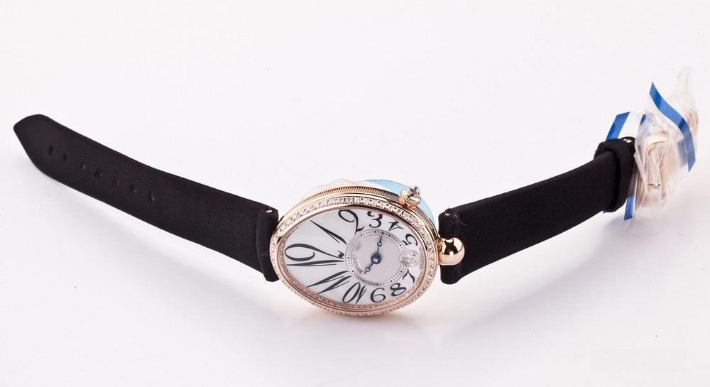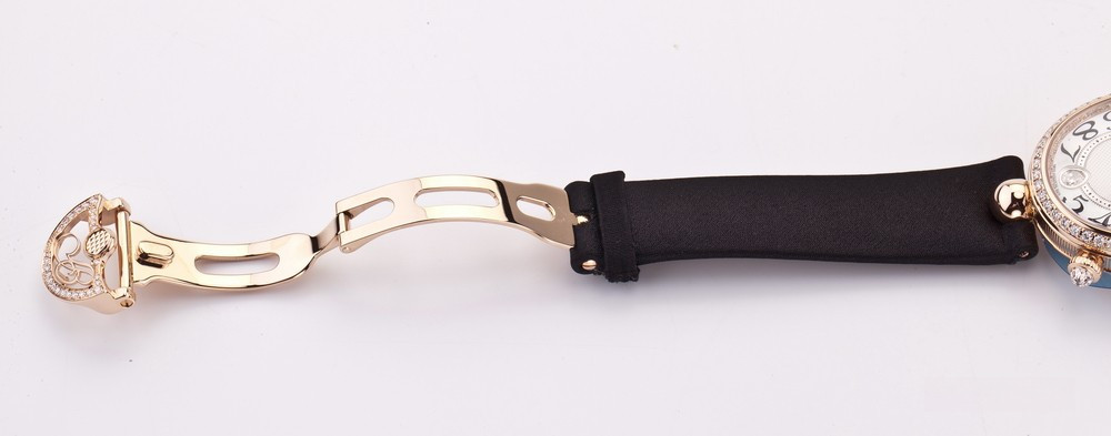 Овальный корпус Breguet Reine de Naples 8918BR/58/864 D00D выполнен из белого 18-каратного розового золота и обладает размером 28.45 x 36.5 x 10.05 мм. Заводная головка инкрустирована белым бриллиантом 0.26 карат. На циферблате из цельной пластины белого золота великолепно смотрится посеребренный узор гильоше, который сделан вручную. Стрелки изготовлены из вороненной стали, и украшены "яблоками" Breguet. Механизм 537/1 имеет запас хода на 40 часов. Водонепроницаемость модели составляет 30 метров. Безель украшен 117-ю белыми бриллиантами 0.99 карат. Часы завершает черный атласный ремешок, который оснащен золотой раскладывающейся застежкой. Часы представлены в элегантной фирменной коробке с документами.