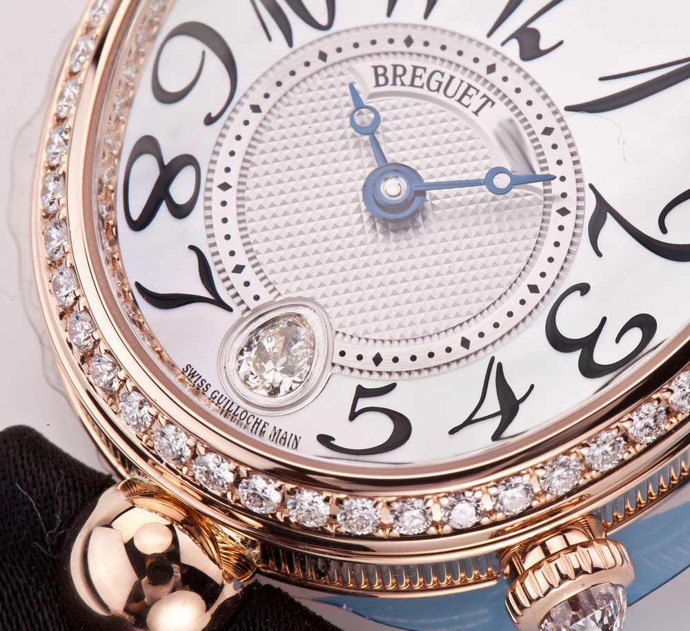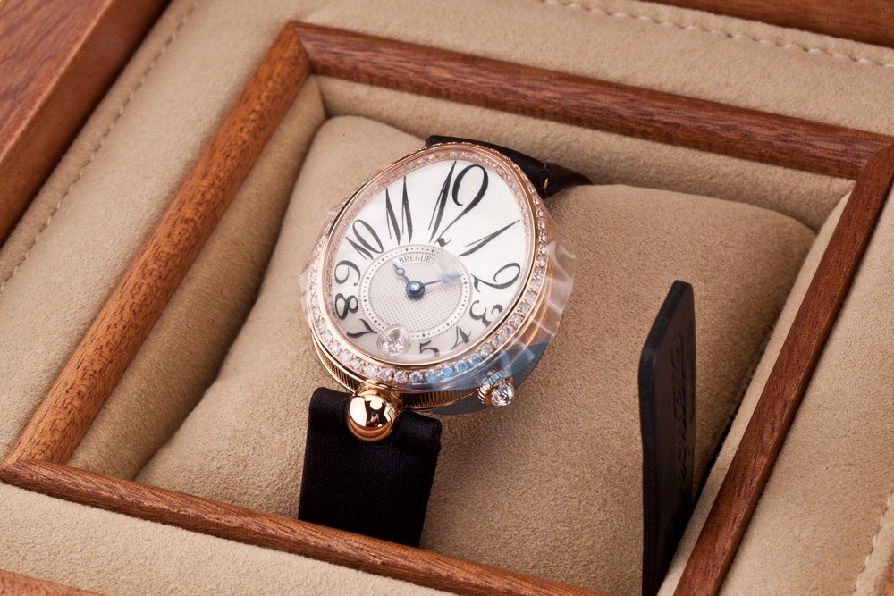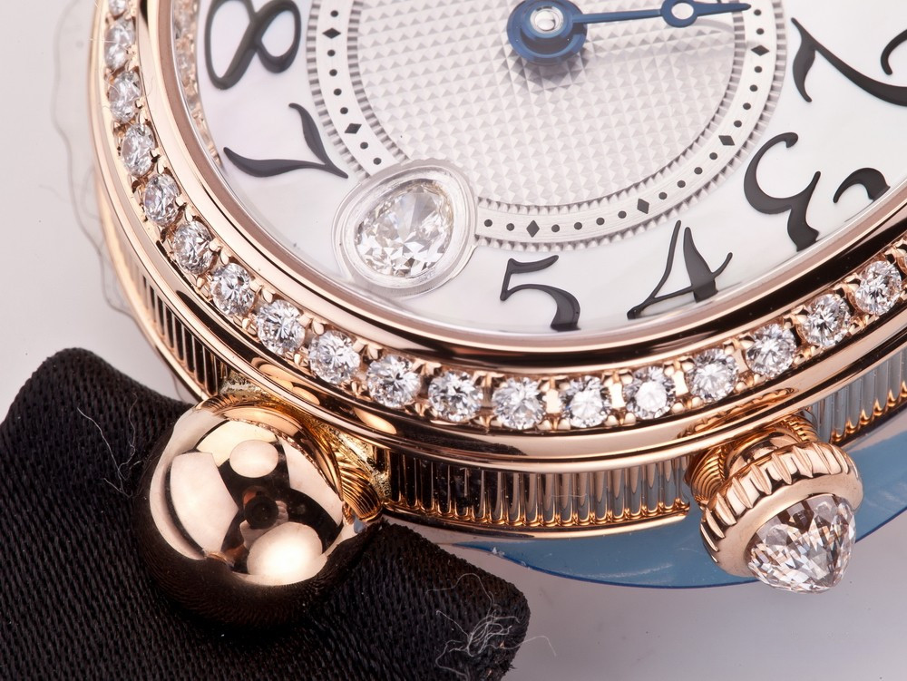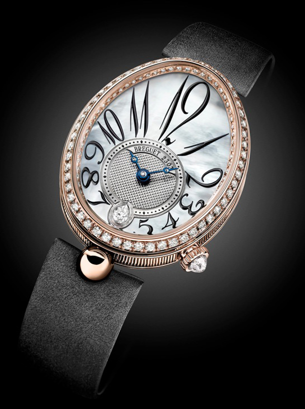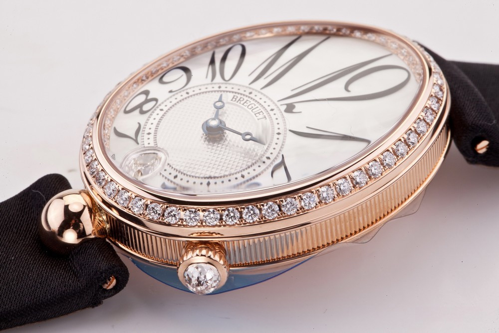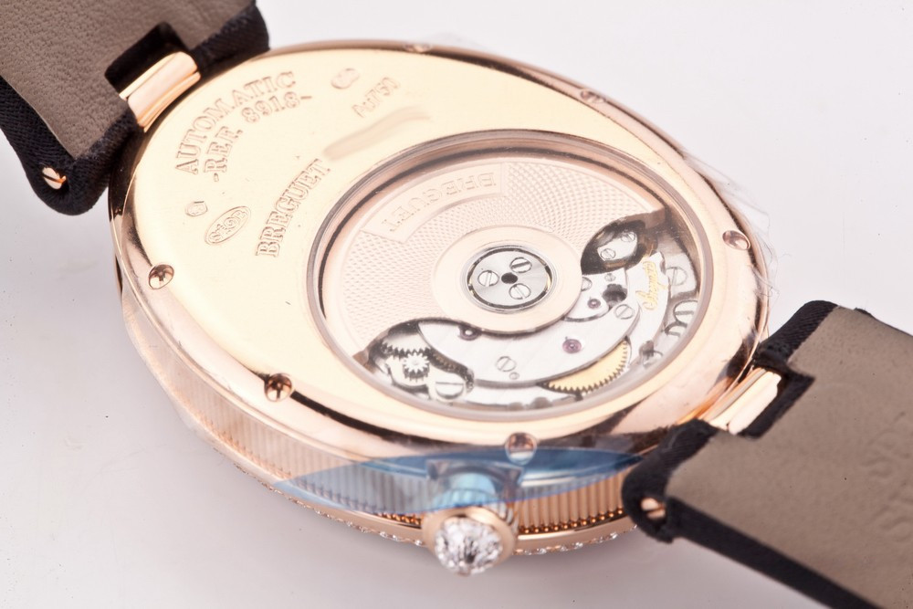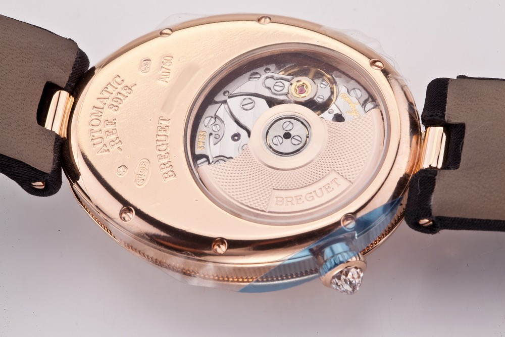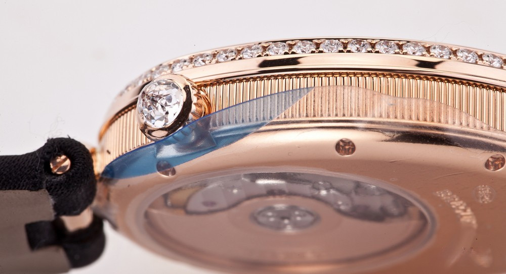 Овальный корпус Breguet Reine de Naples 8918BR/58/864 D00D выполнен из белого 18-каратного розового золота и обладает размером 28.45 x 36.5 x 10.05 мм. Заводная головка инкрустирована белым бриллиантом 0.26 карат. На циферблате из цельной пластины белого золота великолепно смотрится посеребренный узор гильоше, который сделан вручную. Стрелки изготовлены из вороненной стали, и украшены "яблоками" Breguet. Механизм 537/1 имеет запас хода на 40 часов. Водонепроницаемость модели составляет 30 метров. Безель украшен 117-ю белыми бриллиантами 0.99 карат. Часы завершает черный атласный ремешок, который оснащен золотой раскладывающейся застежкой. Часы представлены в элегантной фирменной коробке с документами.
