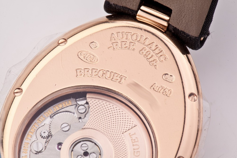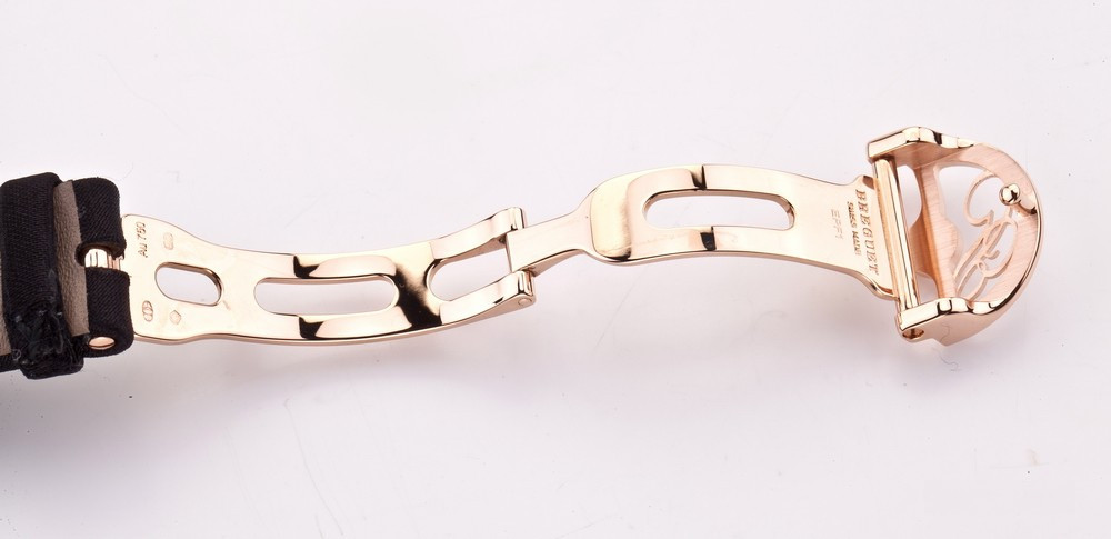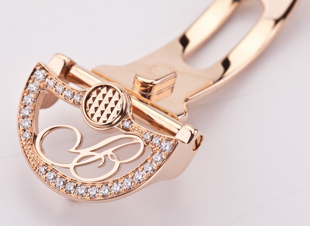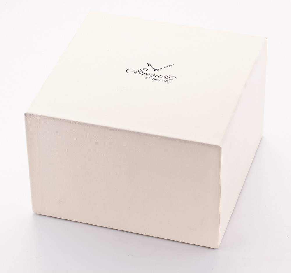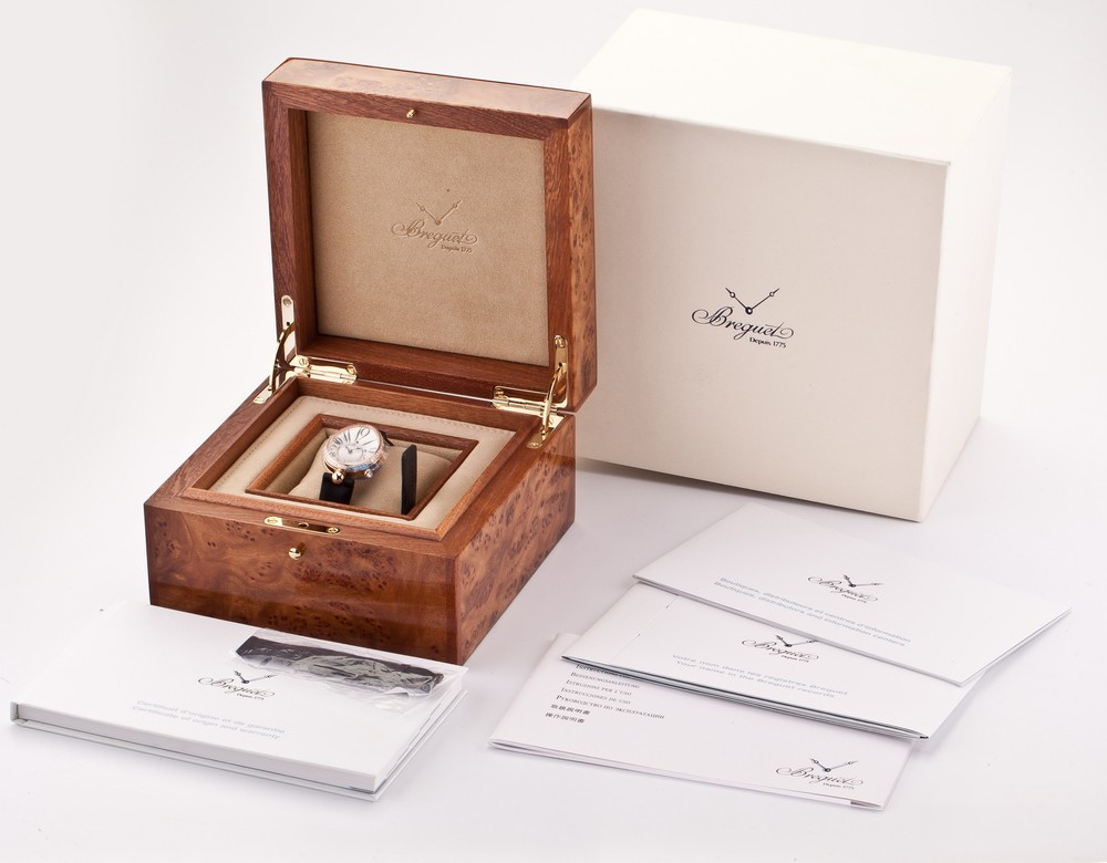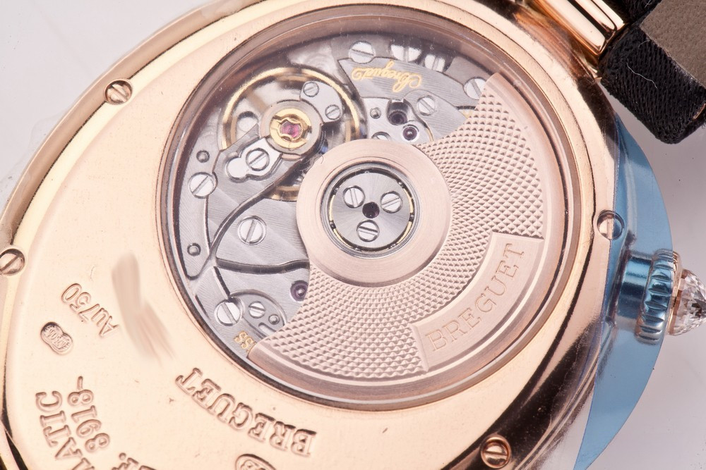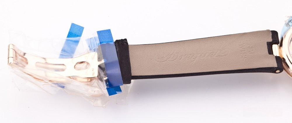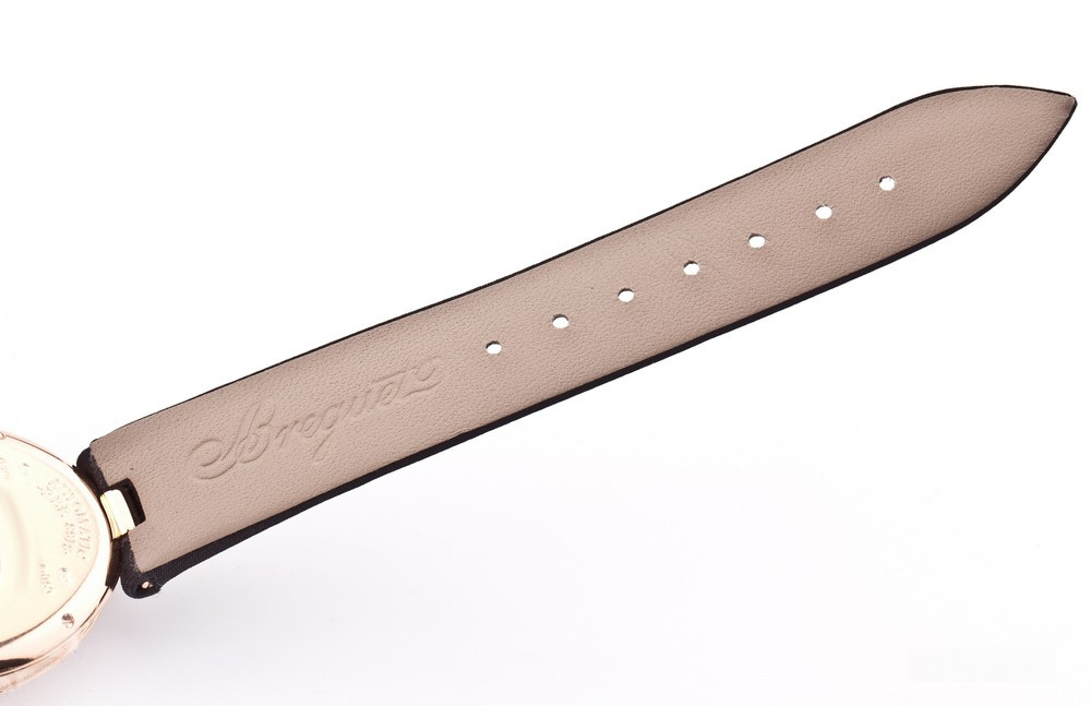 Овальный корпус Breguet Reine de Naples 8918BR/58/864 D00D выполнен из белого 18-каратного розового золота и обладает размером 28.45 x 36.5 x 10.05 мм. Заводная головка инкрустирована белым бриллиантом 0.26 карат. На циферблате из цельной пластины белого золота великолепно смотрится посеребренный узор гильоше, который сделан вручную. Стрелки изготовлены из вороненной стали, и украшены "яблоками" Breguet. Механизм 537/1 имеет запас хода на 40 часов. Водонепроницаемость модели составляет 30 метров. Безель украшен 117-ю белыми бриллиантами 0.99 карат. Часы завершает черный атласный ремешок, который оснащен золотой раскладывающейся застежкой. Часы представлены в элегантной фирменной коробке с документами.