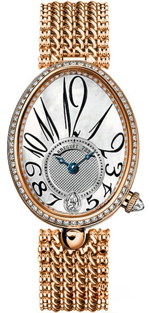 Овальный корпус Breguet Reine de Naples 8918BR/58/J20 D000 выполнен из розового 18-каратного золота и обладает размером 28.45 x 36.5 x 10.05 мм. Заводная головка инкрустирована белым бриллиантом 0.26 карат. На белом жемчужном циферблате великолепно смотрится посеребренный узор гильоше, который сделан вручную. Стрелки изготовлены из вороненной стали, и украшены "яблоками" Breguet. Механизм 537/1 имеет запас хода на 40 часов. Водонепроницаемость модели составляет 30 метров. Безель украшен 117-ю белыми бриллиантами 0.99 карат. Часы завершает золотой браслет, который оснащен золотой раскладывающейся застежкой.
