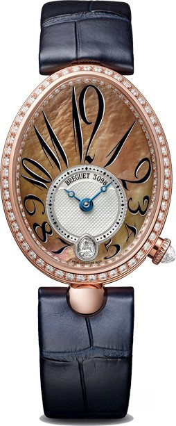 Овальный корпус Breguet Reine de Naples 8918BB/58/J20 D000 выполнен из белого 18-каратного золота и обладает размером 28.45 x 36.5 x 10.05 мм. Заводная головка инкрустирована белым бриллиантом 0.26 карат. На коричневом жемчужном циферблате великолепно смотрится посеребренный узор гильоше, который сделан вручную. Стрелки изготовлены из вороненной стали, и украшены "яблоками" Breguet. Механизм 537/1 имеет запас хода на 40 часов. Водонепроницаемость модели составляет 30 метров. Безель украшен 117-ю белыми бриллиантами 0.99 карат. Часы завершает ремешок из кожи аллигатора, который оснащен золотой раскладывающейся застежкой.