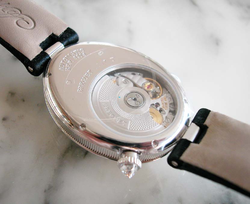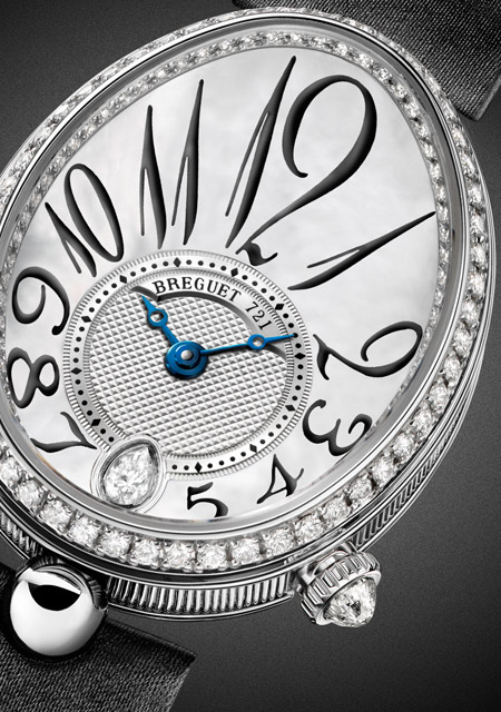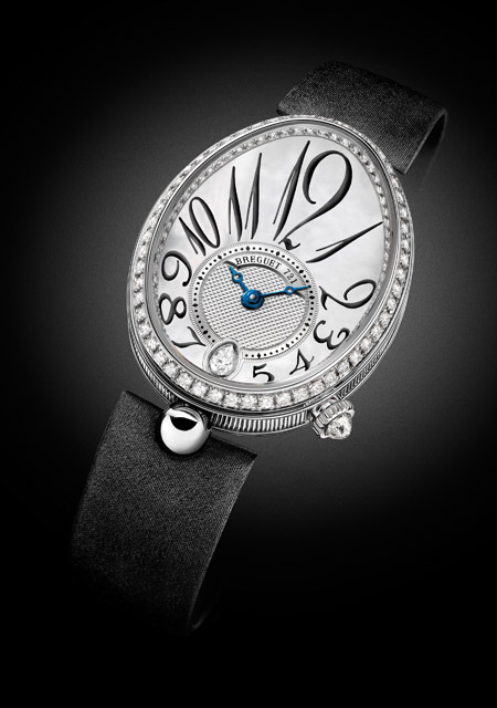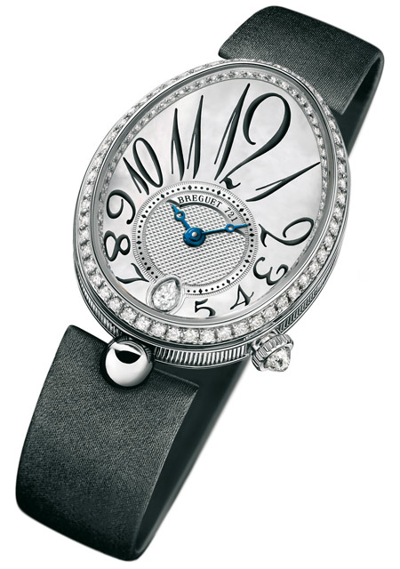 Часы Breguet Reine de Naples 8918BB/58/864 D00D выпущены в корпусе из белого золота 18к, размером 28.45 х 36.5 х 10.05 мм и водонепроницаемостью 30 м с безелем из 117-и белых бриллиантов 0.99 ct. и заводной головкой, инкрустированной белым бриллиантом 0.26 ct. Внутри корпуса установлен автоматический механизм, Калибр 537/1. На белом жемчужном с серебристым гильошированном циферблате с белым бриллиантом 0.09 ct. отображаются часы, минуты. Запас хода 40 часов. Часы комплектуются атласным ремешком с золотой 18к вставкой и раскладывающейся застежкой.